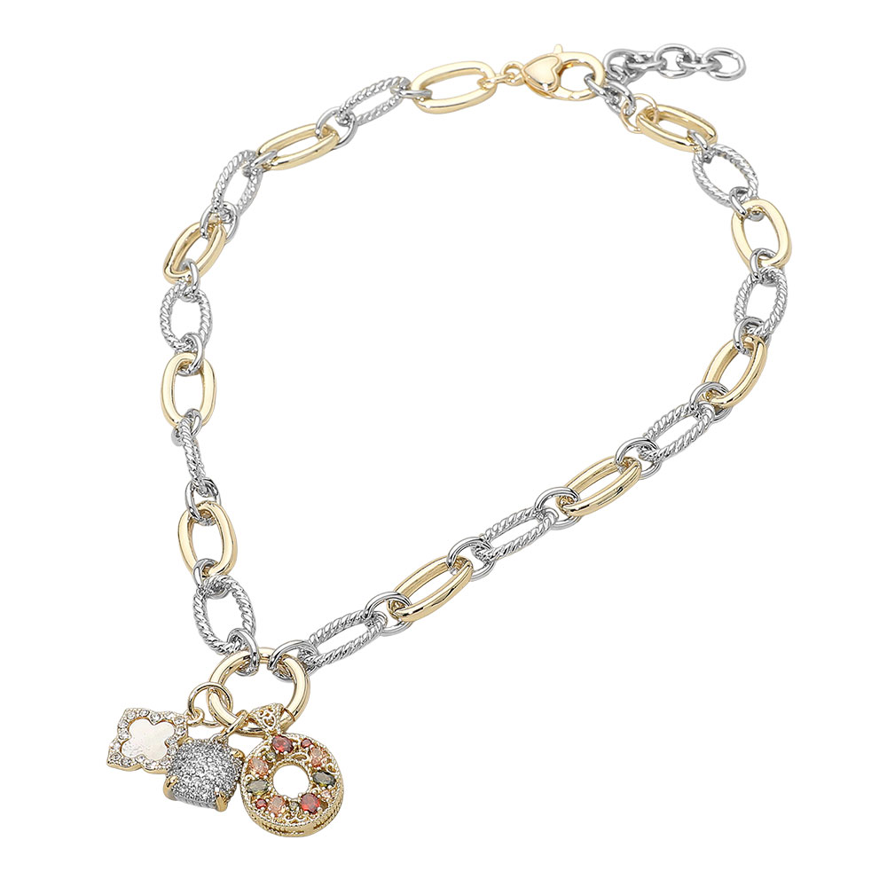 Details • Necklace Size : 17" + 2" L • Pendant Size : 0.7" X 1" • Elevate your style with this two-tone link necklace featuring a mix of textured and smooth chains accented by decorative charms. Its versatile, eye-catching design adds a chic touch to casual or dressy looks, making it perfect for everyday wear or gifting. • CZ Cubic Zirconia • Gold Dipped