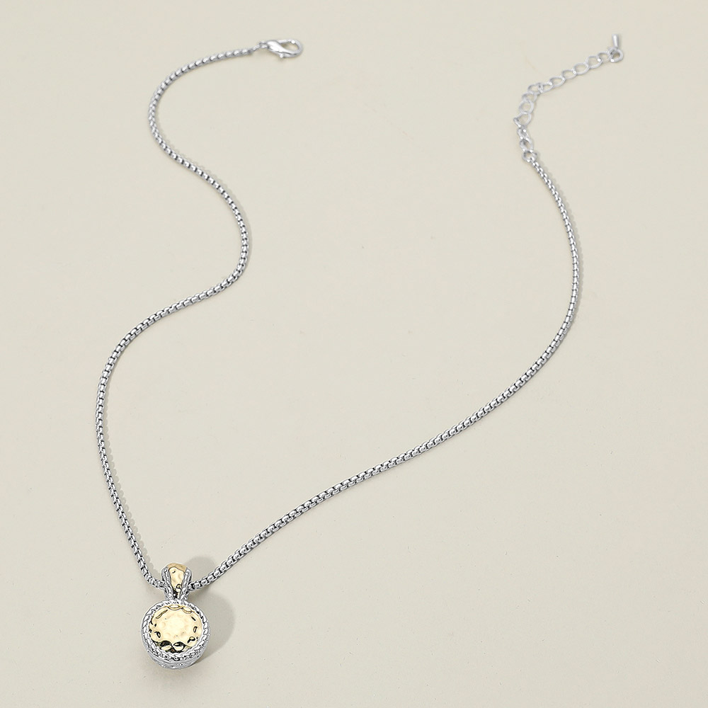 Details • Necklace Size : 16" + 2" L • Pendant Size : 0.6" X 1" • Refined chain necklace featuring a round textured pendant framed with intricate detailing. Lightweight, adjustable, and perfect for everyday wear or layering. A timeless accent that adds subtle sophistication to any outfit. • Gold Dipped