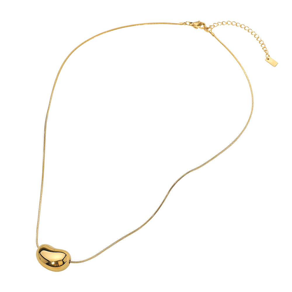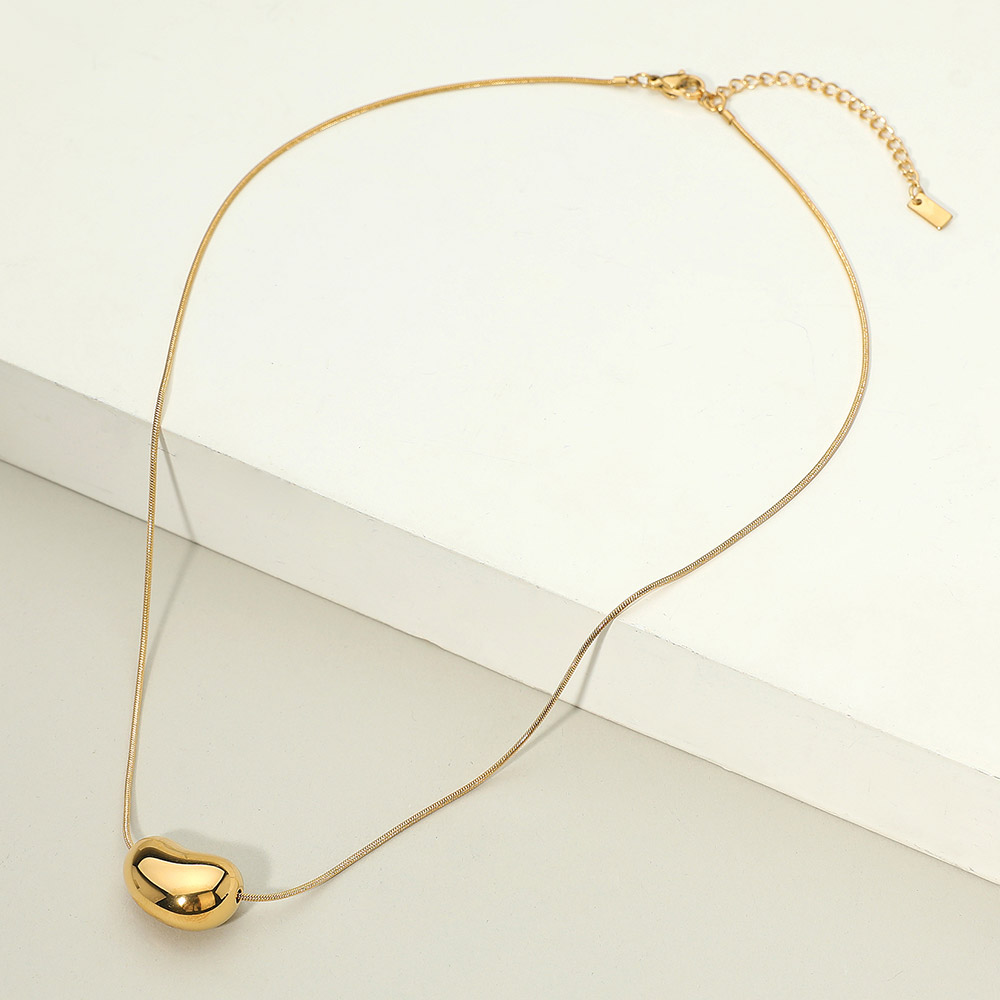 Details • Necklace Size : 16" + 2" L • Pendant Size : 0.7" X 0.5" • This stainless steel necklace highlights a smooth bean-shaped pendant on a fine chain, blending modern simplicity with artistic flair. Its polished finish adds refined elegance, making it a versatile accessory that complements both everyday and sophisticated styles effortlessly. • Gold Dipped • Stainless Steel