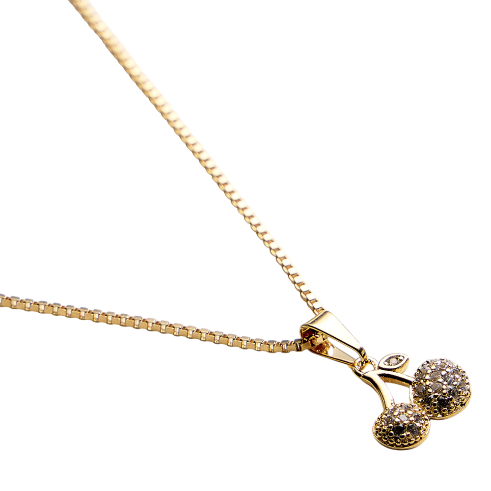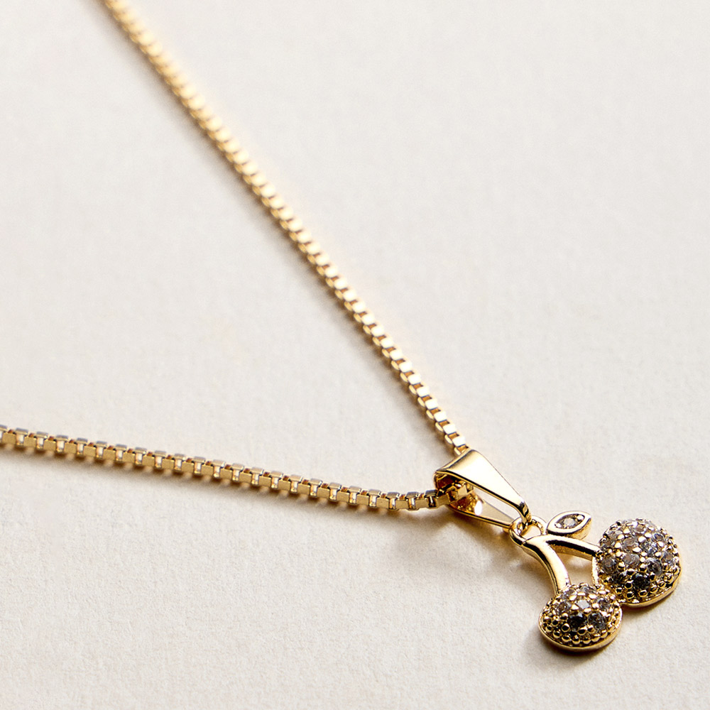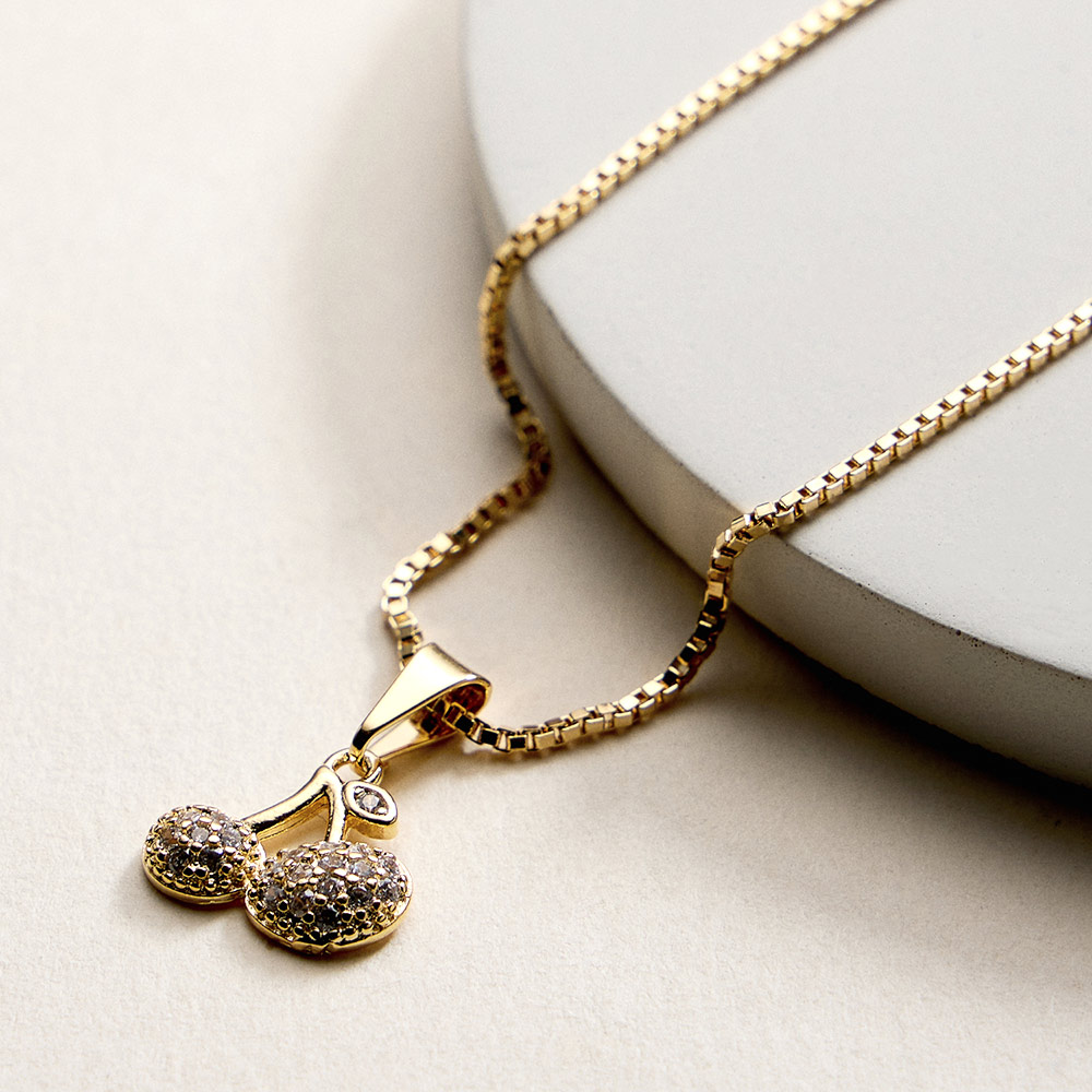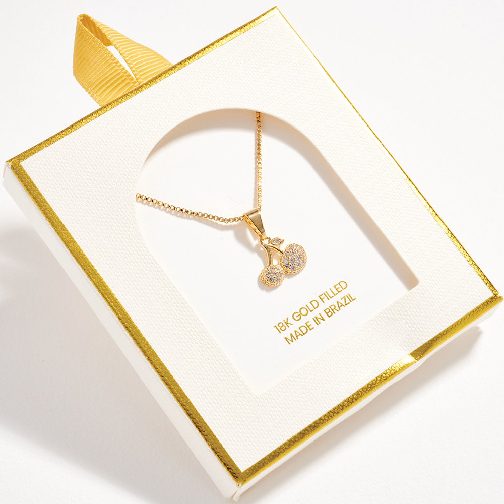 Details • Necklace Size : 18" + 1.75" L • Pendant Size : 0.5" X 1" • This cherry charm pendant necklace adds a playful yet polished accent to everyday styling. Featuring a sweet double-cherry silhouette, it’s perfect for layering or wearing solo. A versatile jewelry piece ideal for gift shops, boutiques, and trend-forward collections seeking fun, feminine appeal. • CZ Cubic Zirconia • Gold Filled • Hypoallergenic • Lead and Nickel Compliant • Made In Brazil