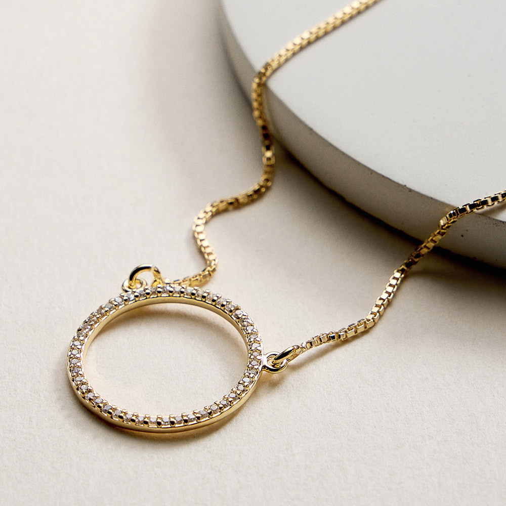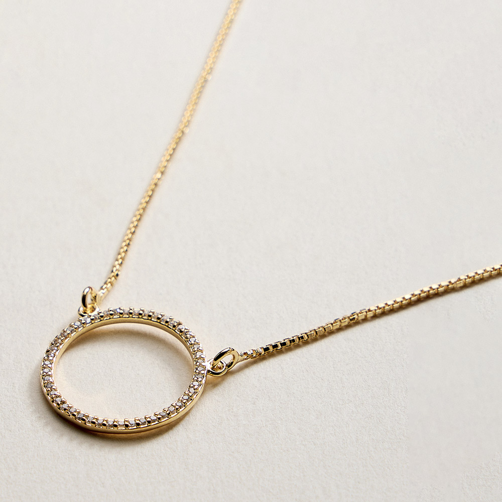 Details • Necklace Size : 18" + 1.75" L • Pendant Size : 0.75" X 0.75" • This circle charm pendant necklace features a clean, timeless silhouette that symbolizes unity, balance, and everyday elegance. Designed for easy layering or solo wear, it complements casual and dressy looks alike. A versatile, gift-ready jewelry piece ideal for boutiques seeking modern, minimalist necklaces with broad customer appeal. • CZ Cubic Zirconia • Gold Filled • Hypoallergenic • Lead and Nickel Compliant • Made In Brazil