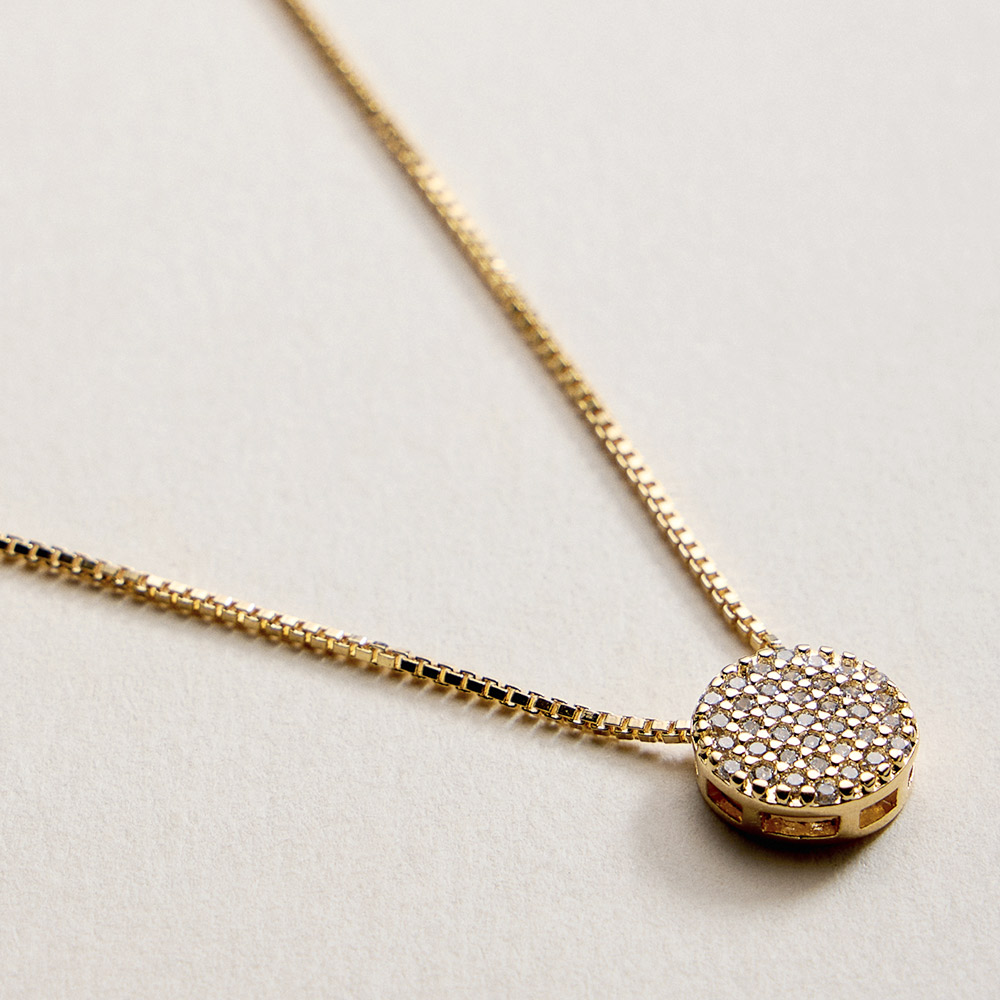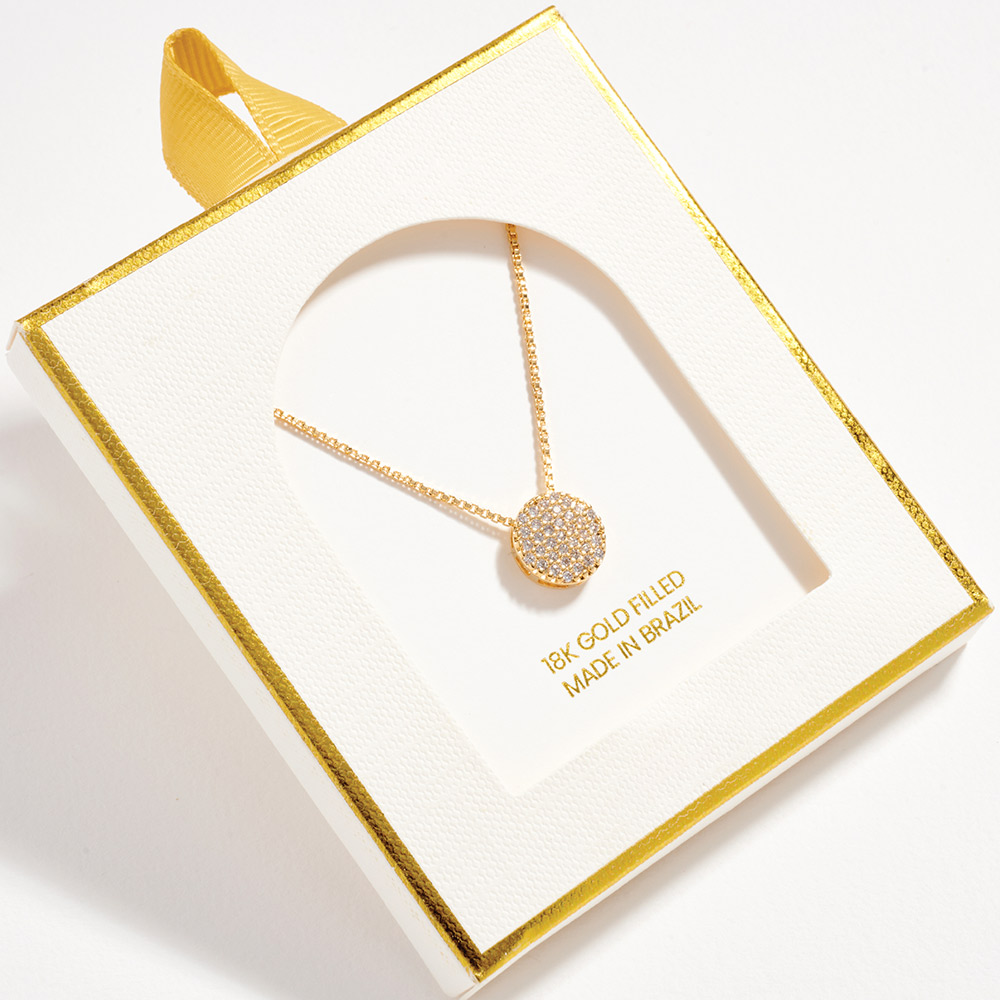 • This round pavĂ© disc pendant necklace features a refined, minimalist design with shimmering detail that adds subtle elegance to any look. Perfect for everyday wear or special occasions, it layers effortlessly or shines on its own. A versatile jewelry piece ideal for boutiques, gifting displays, and customers seeking timeless, modern style.
