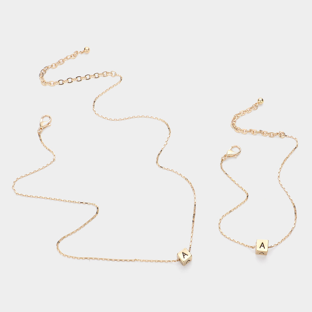 2PCS - -A- Initial Monogram Metal Cube Pendant Necklace / Bracelet Set