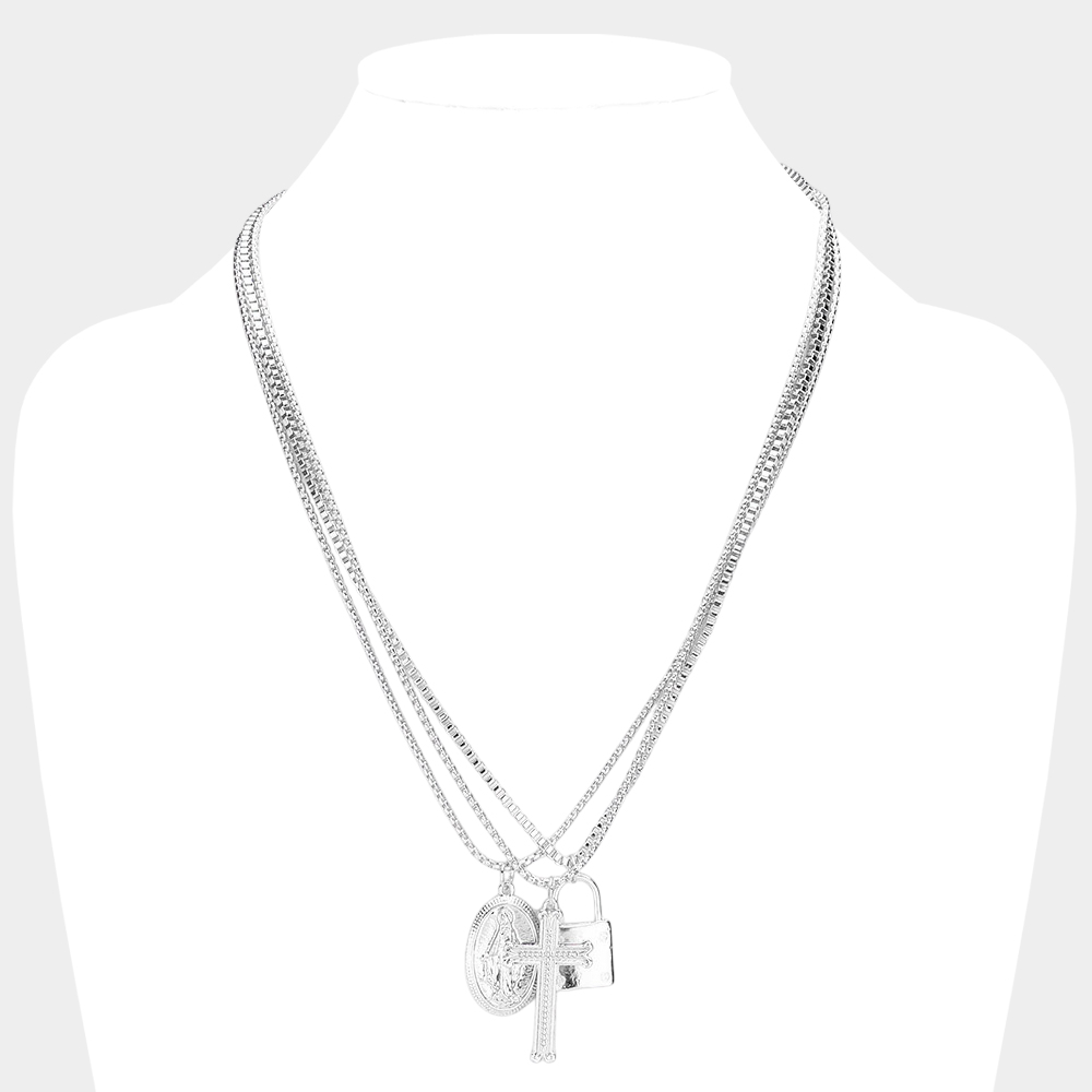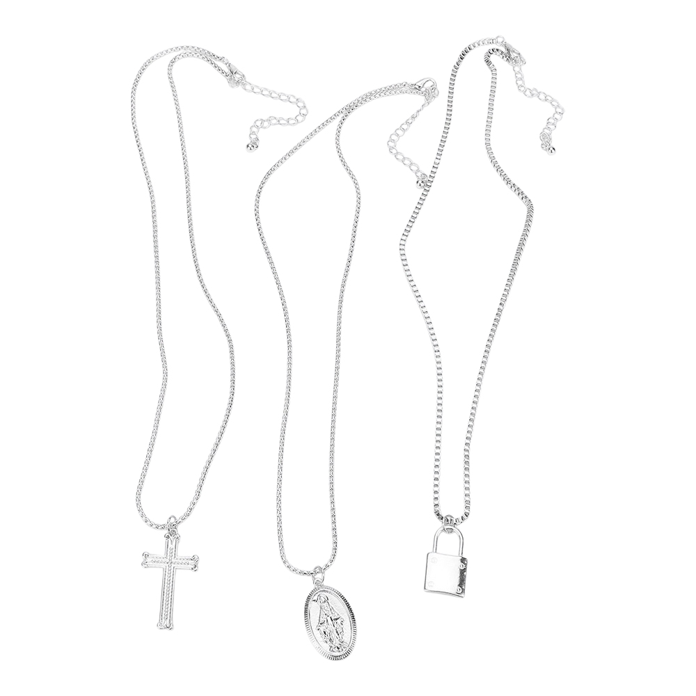 3PCS - Virgin Mary Cross Master Lock Pendant Metal Layered Necklace