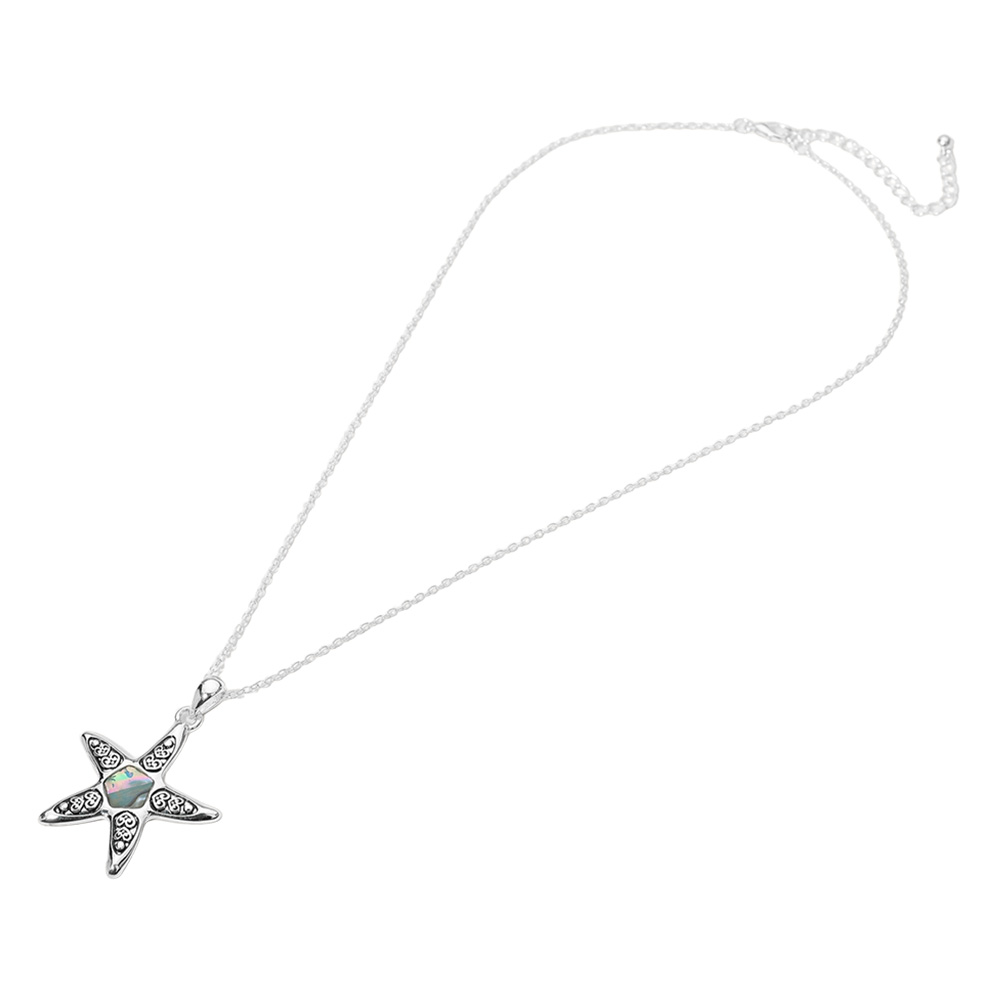 Details • Necklace Size : 20" + 2.5" L • Pendant Size : 1.3" X 1.6" • Ocean-inspired starfish pendant necklace with intricate detailing and a shimmering abalone center. A delicate and stylish accessory perfect for beach lovers or coastal fashion. Lightweight and ideal for everyday or vacation wear. • Lead and Nickel Compliant