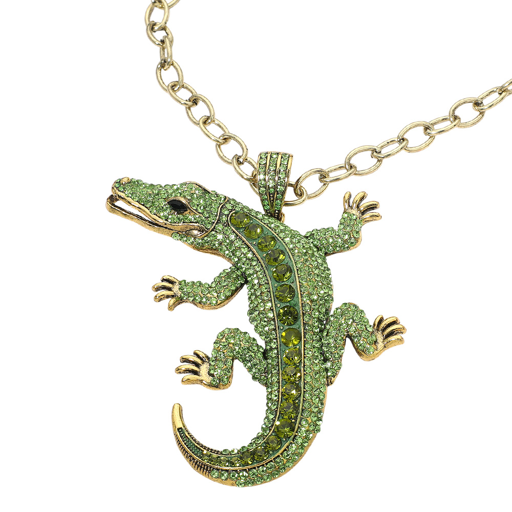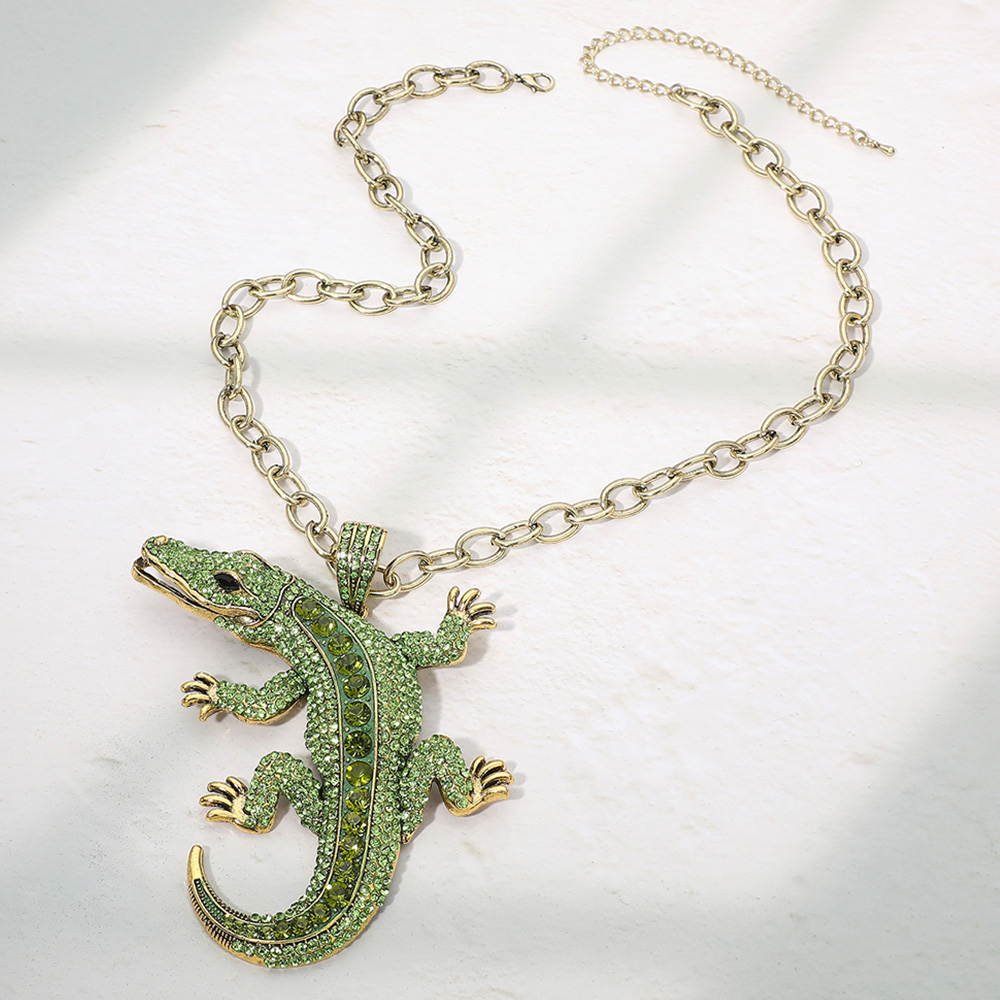 • Bold alligator pendant necklace with shimmering accents on a chunky chain. This statement jewelry piece combines edgy charm with artistic flair, perfect for fashion-forward looks or themed events, adding a fierce and captivating touch to any stylish outfit.