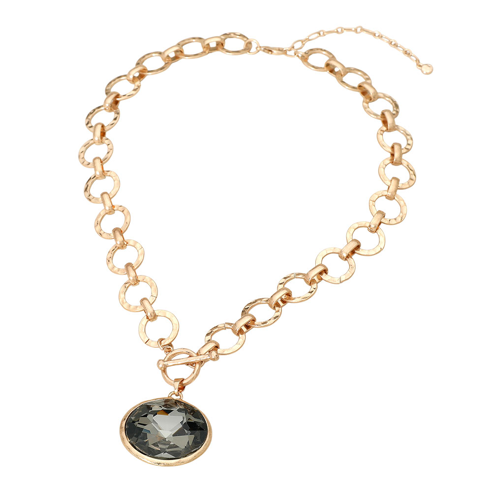 Details • Necklace Size : 18" + 3" L • Pendant Size : 1.4" X 1.4" • Toggle Closure • Add a touch of elegance to your style with this hammered link chain necklace featuring a stunning faceted gem pendant. Designed for both sophistication and edge, this piece is ideal for evening wear or everyday glamour, making it a standout addition to any jewelry collection. • Lead and Nickel Compliant
