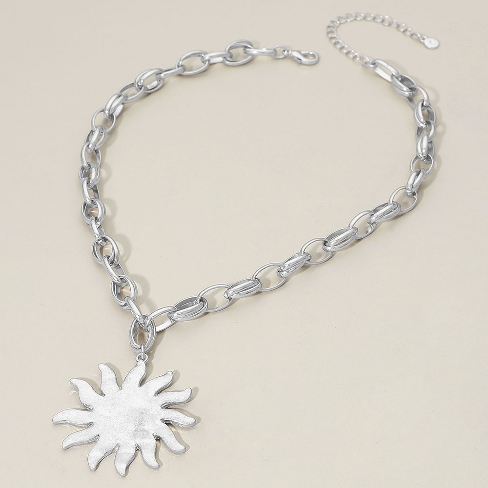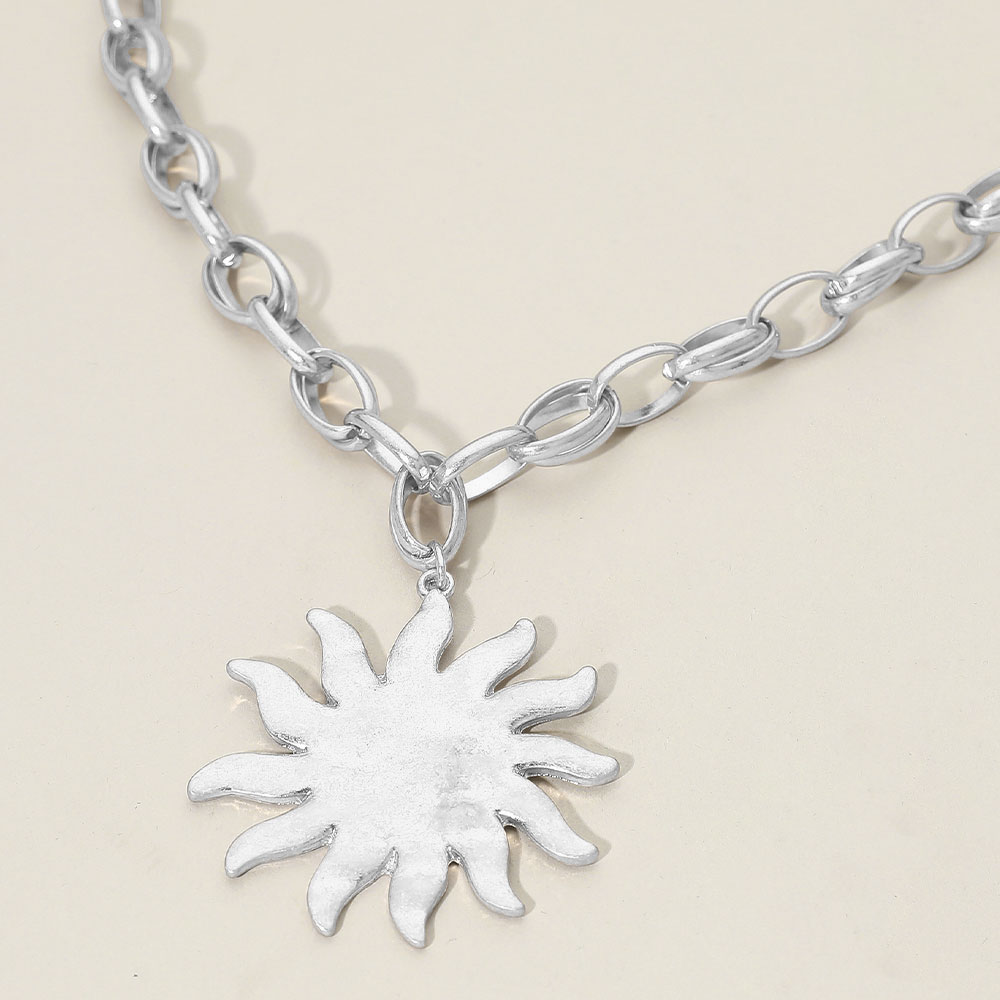 Brushed Metal Sunburst Pendant Chunky Chain Necklace