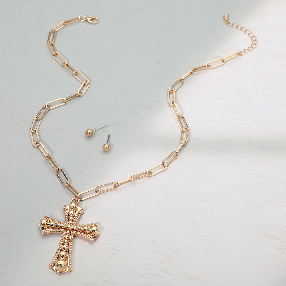 Details • Necklace Size : 17.5" + 2.25" L • Pendant Size : 1.5" X 2.25" • Earrings Size : 0.2" L • Elegant cross pendant necklace set featuring a bold link chain and matching stud earrings. The detailed cross design adds a touch of modern sophistication, perfect for layering or statement wear, making it an ideal accessory for everyday elegance or special occasions. • Lead and Nickel Compliant