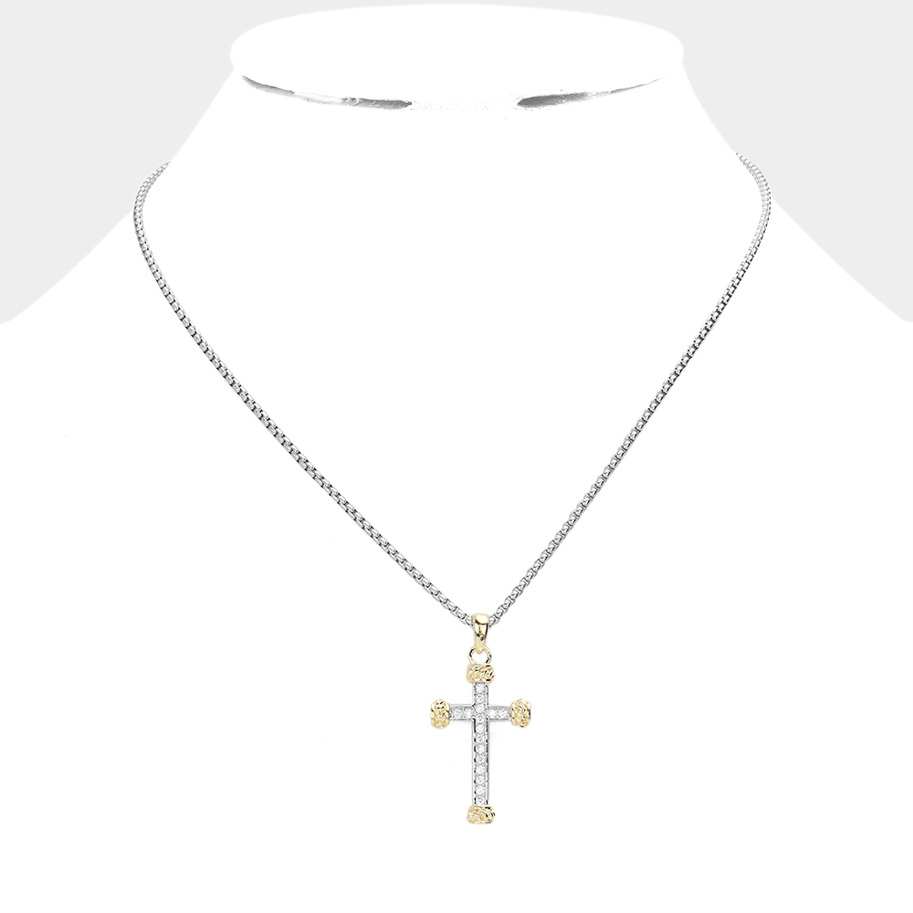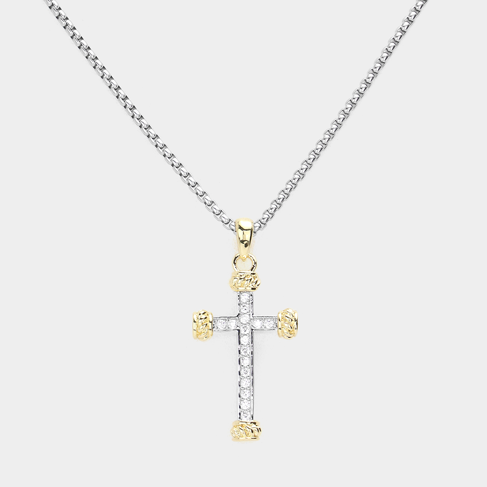 14K Gold Plated CZ Stone Paved Cross Pendant Double Chain Necklace