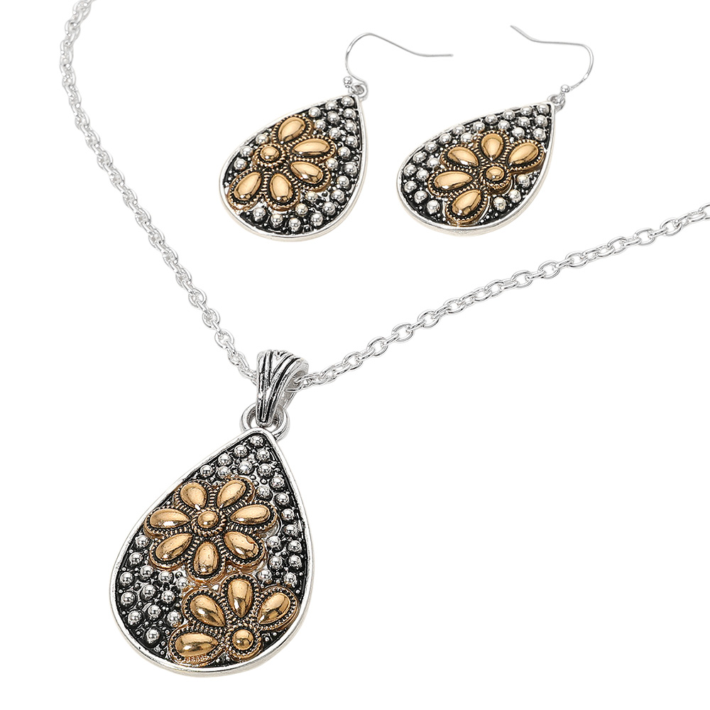 • Graceful teardrop-shaped jewelry set featuring a detailed pendant necklace and matching earrings with charming floral designs and textured accents. Ideal for adding a touch of elegance to casual or special occasion looks.