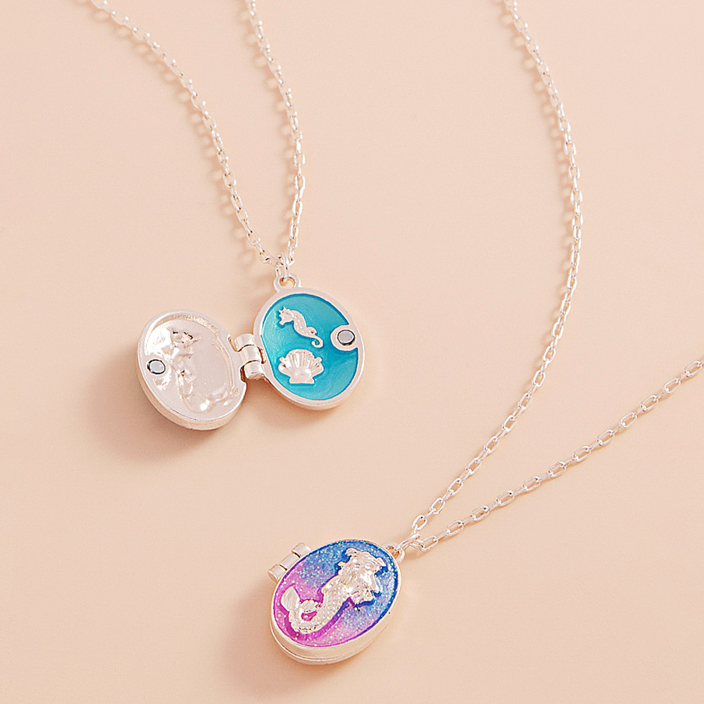 Details • Necklace Size : 17.25" + 3" L • Pendant Size : 0.5" X 0.75" • Elegant oval locket pendant featuring a detailed mermaid motif. Perfect for ocean-inspired fashion and lovers of whimsical, nautical jewelry pieces. Great gift for all ages. • Lead and Nickel Compliant