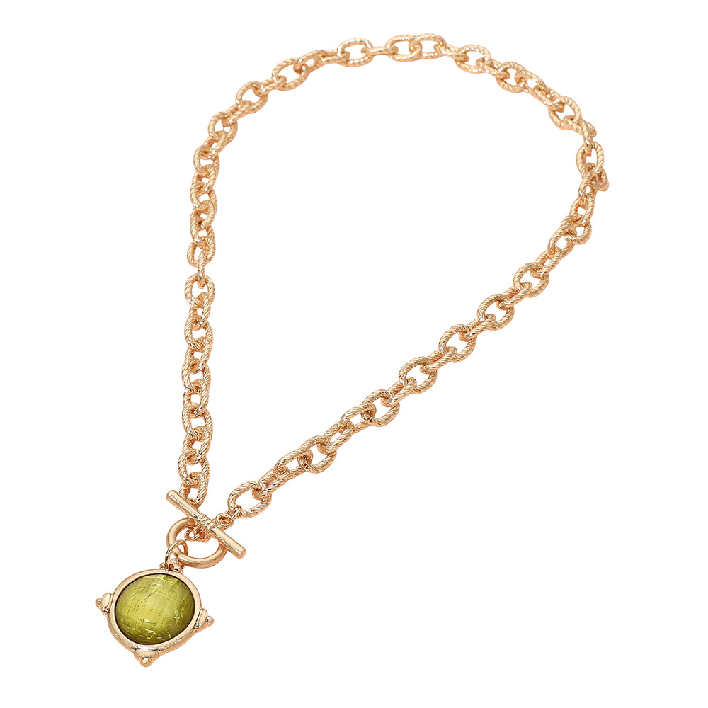 Details • Necklace Size : 18" L • Pendant Size : 1.2" X 1.2" • Elegant chain necklace featuring a round charm with subtle texture and a toggle-style closure. Designed for easy styling, this versatile piece adds a refined statement to casual or elevated looks and layers effortlessly with other necklaces for a modern, curated finish. • Lead and Nickel Compliant