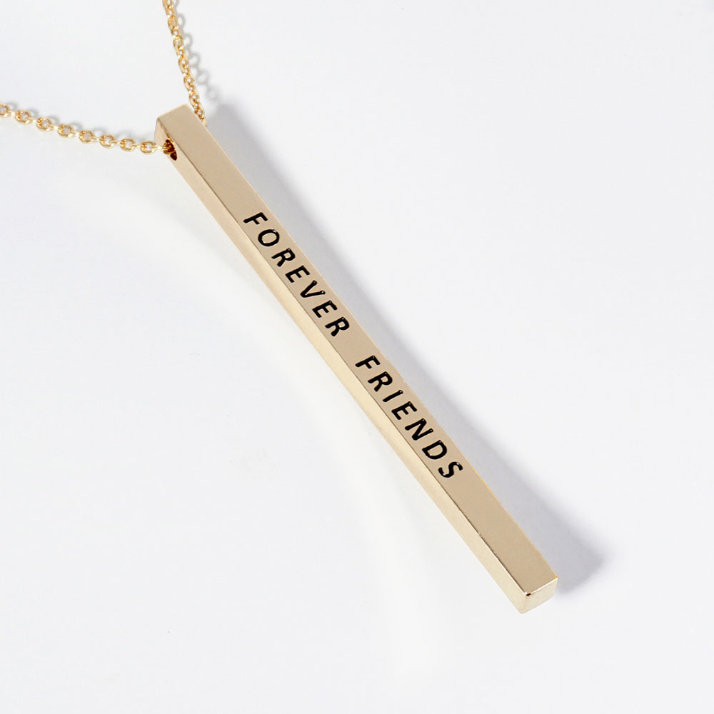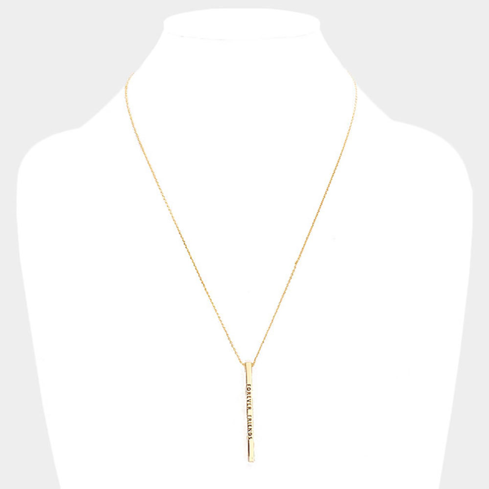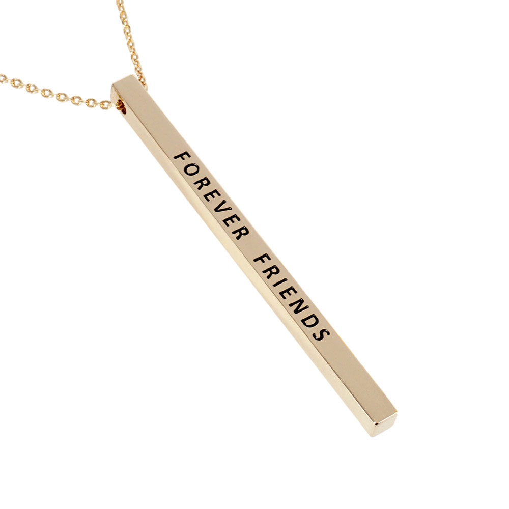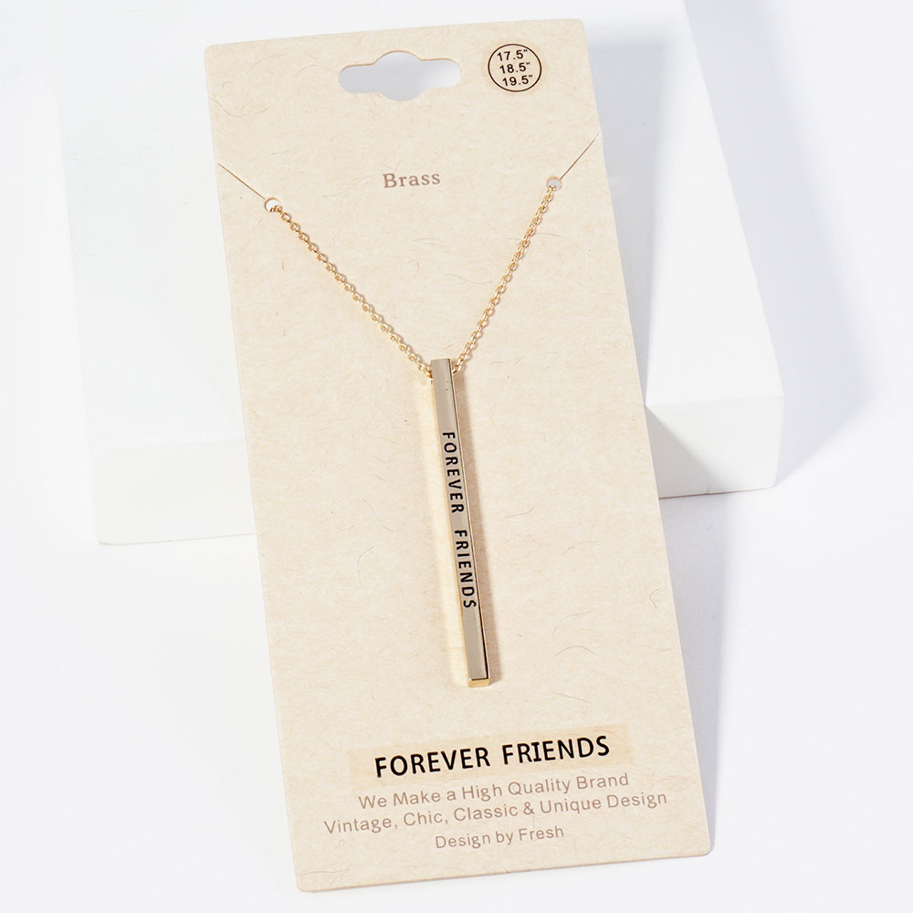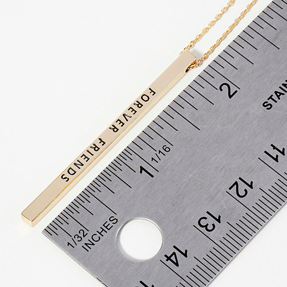 Details • Necklace Size : 19.5" + 2" L • Pendant Size : 0.2" X 2" • Celebrate lasting connections with this engraved vertical bar necklace featuring “FOREVER FRIENDS.” A heartfelt accessory that honors meaningful friendships. Ideal as a sentimental gift to show appreciation, love, and lifelong loyalty between best friends. • Lead and Nickel Compliant • Brass