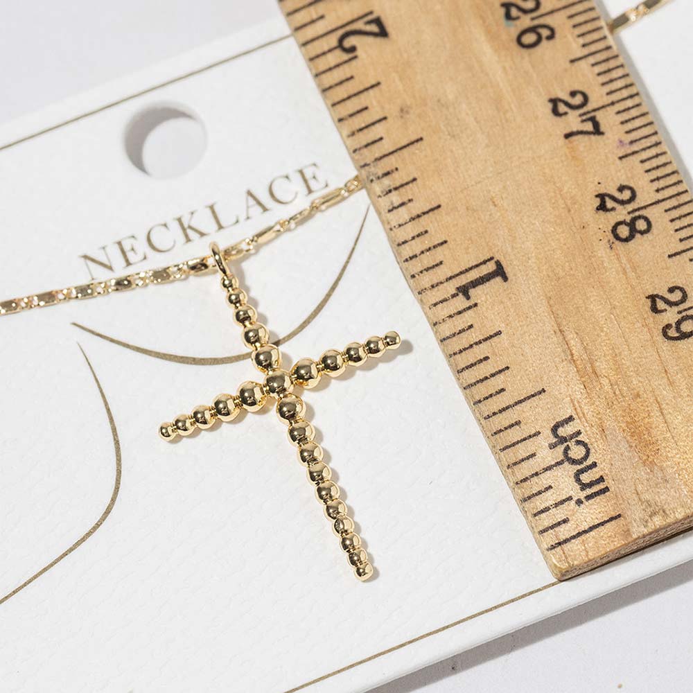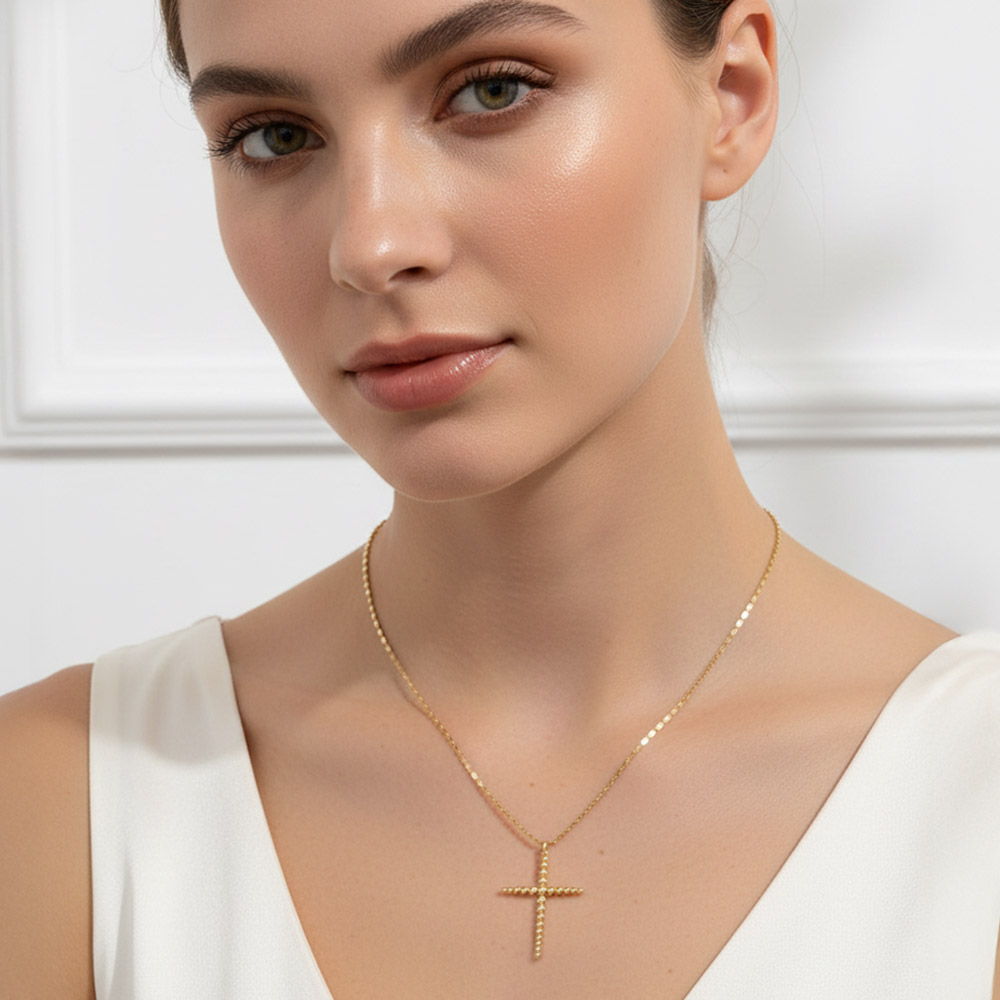 • This beaded cross pendant necklace features a clean, modern cross design with rounded bead detailing for subtle texture and shine. Lightweight and easy to style, it layers beautifully or stands alone as a meaningful everyday accent. Ideal for casual wear, gifting, and boutique collections seeking timeless symbolic jewelry.