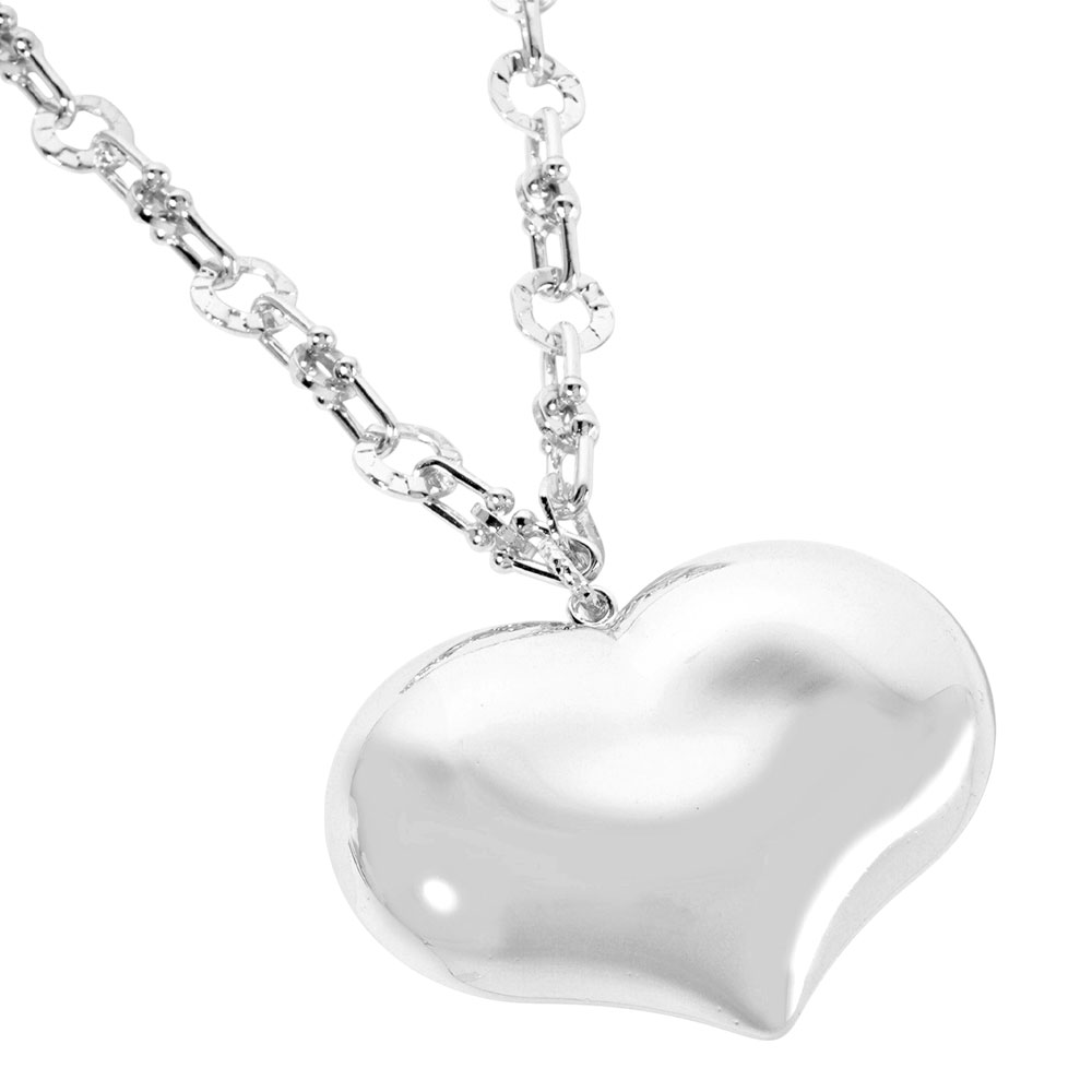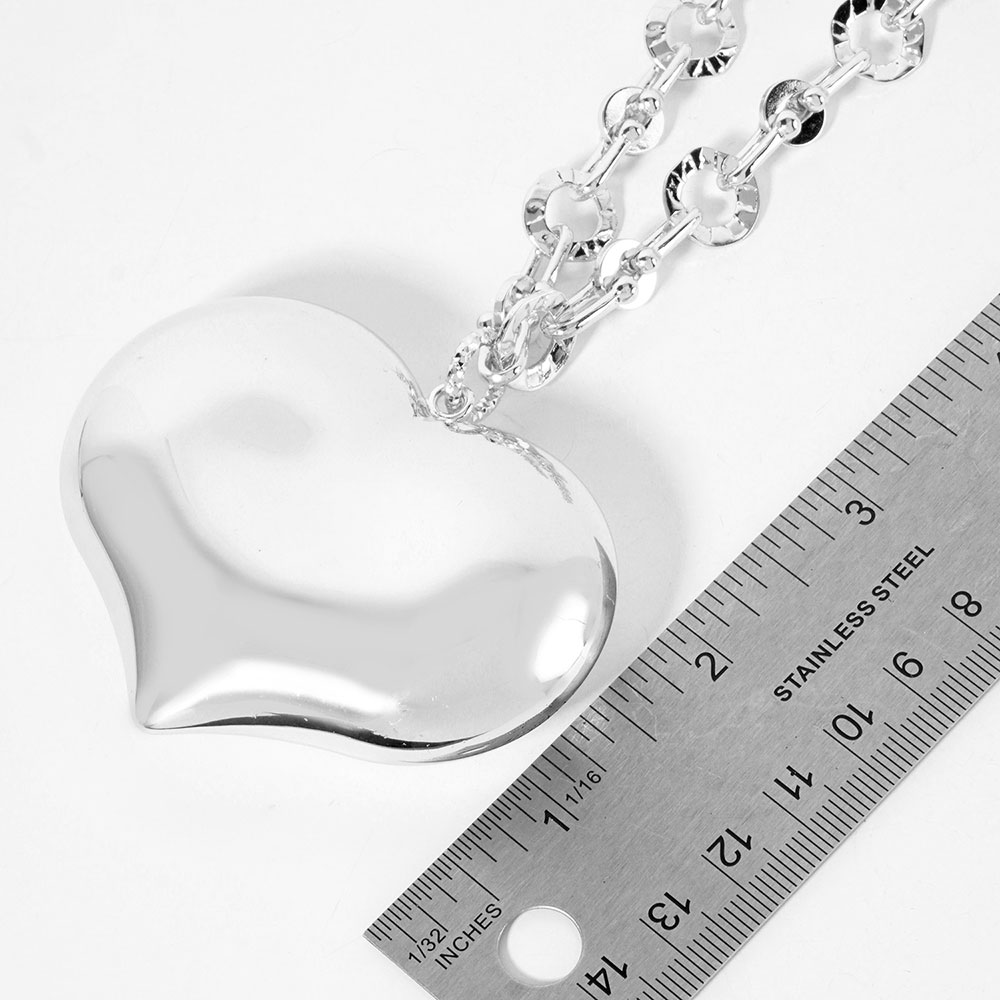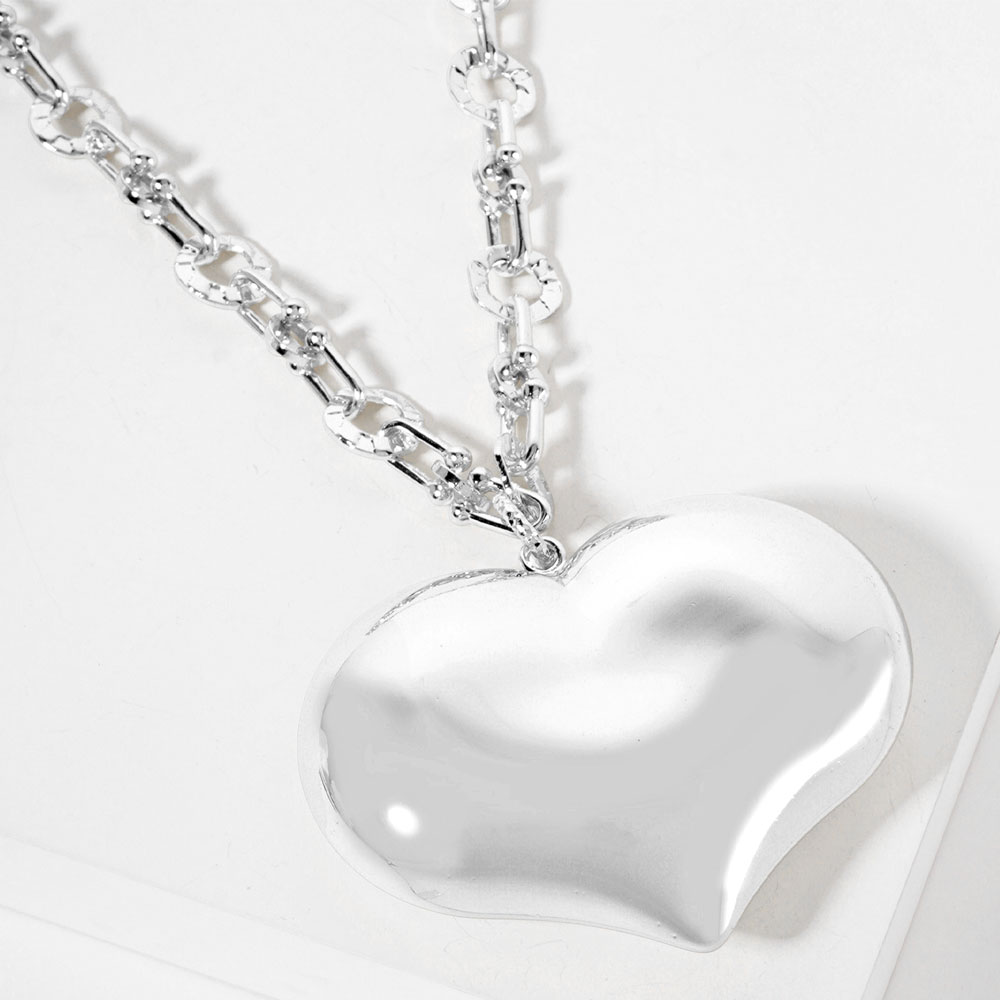 Details • Necklace Size : 18" + 1" L • Pendant Size : 2.75" X 2.25" • Statement heart pendant necklace with sleek chain detailing creates a modern romantic look for everyday or special occasions. Designed to sit beautifully at the neckline, it adds standout shine and effortless elegance to layered or solo jewelry styling. • Gold Dipped • Lead and Nickel Compliant • Made In Korea