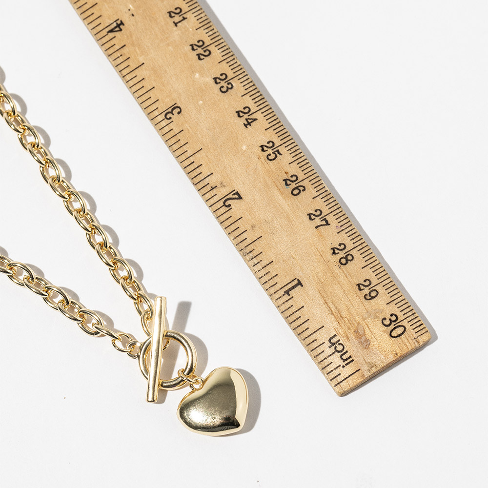 Details • Necklace Size : 18" + 1" L • Pendant Size : 0.7" X 0.5" • Elevate your everyday style with this toggle heart charm chain necklace featuring a smooth, polished pendant on a bold link chain. Its chic, modern design pairs effortlessly with any outfit, making it a perfect accessory for layering or wearing solo. A stylish gift choice for any occasion. • Gold Dipped • Lead and Nickel Compliant • Made In Korea