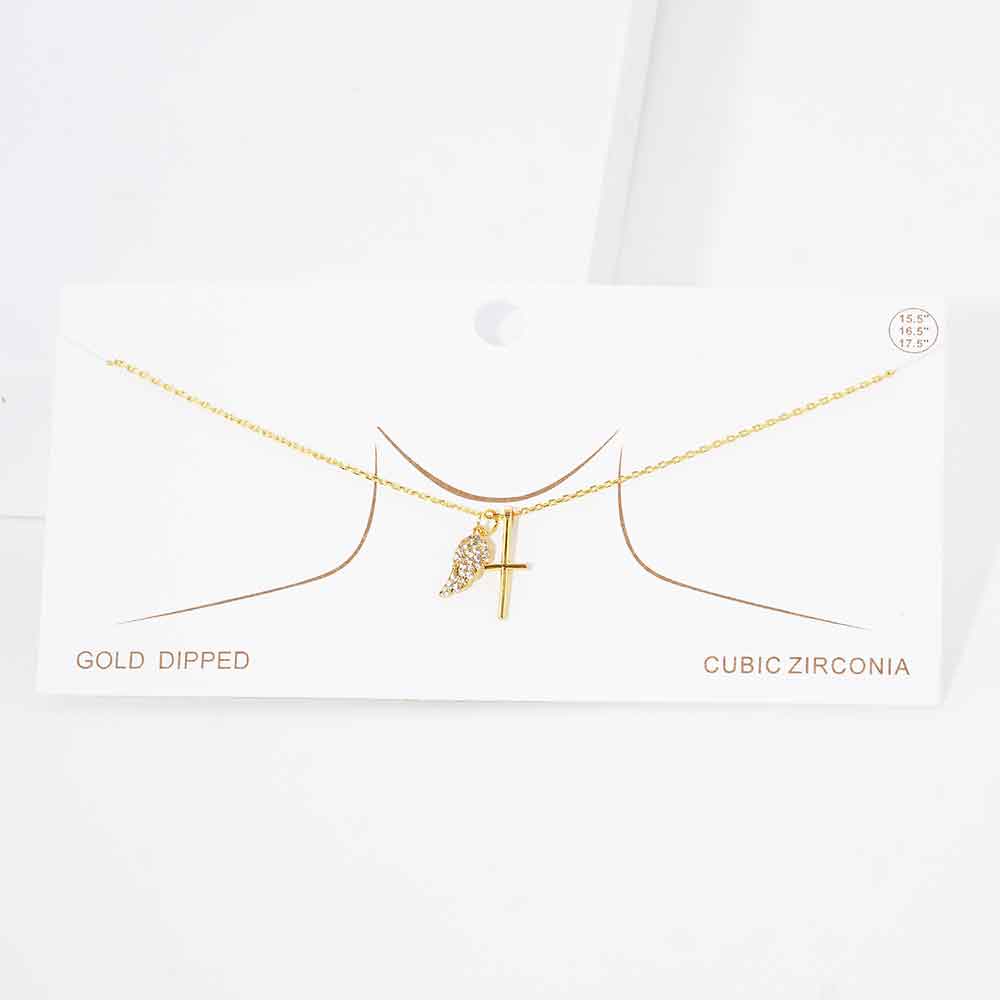 Gold Dipped CZ Embellished Metal Wing Cross Pendant Necklace