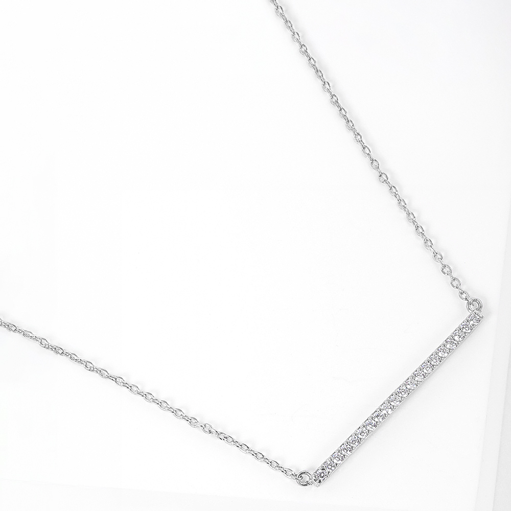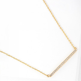 Details • Necklace Size : 15.5" + 2" L • Pendant Size : 1.1" X 0.1" • Delicate bar pendant necklace accented with sparkling crystals for a modern touch. A versatile and elegant accessory that pairs beautifully with any look, ideal for layering or wearing as a chic solo statement. • Lead and Nickel Compliant • Made In Korea • Gold Dipped • CZ Cubic Zirconia