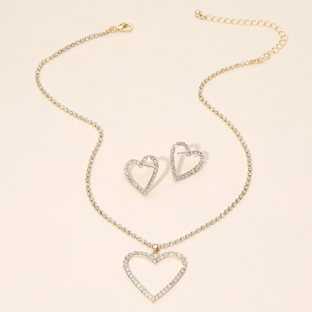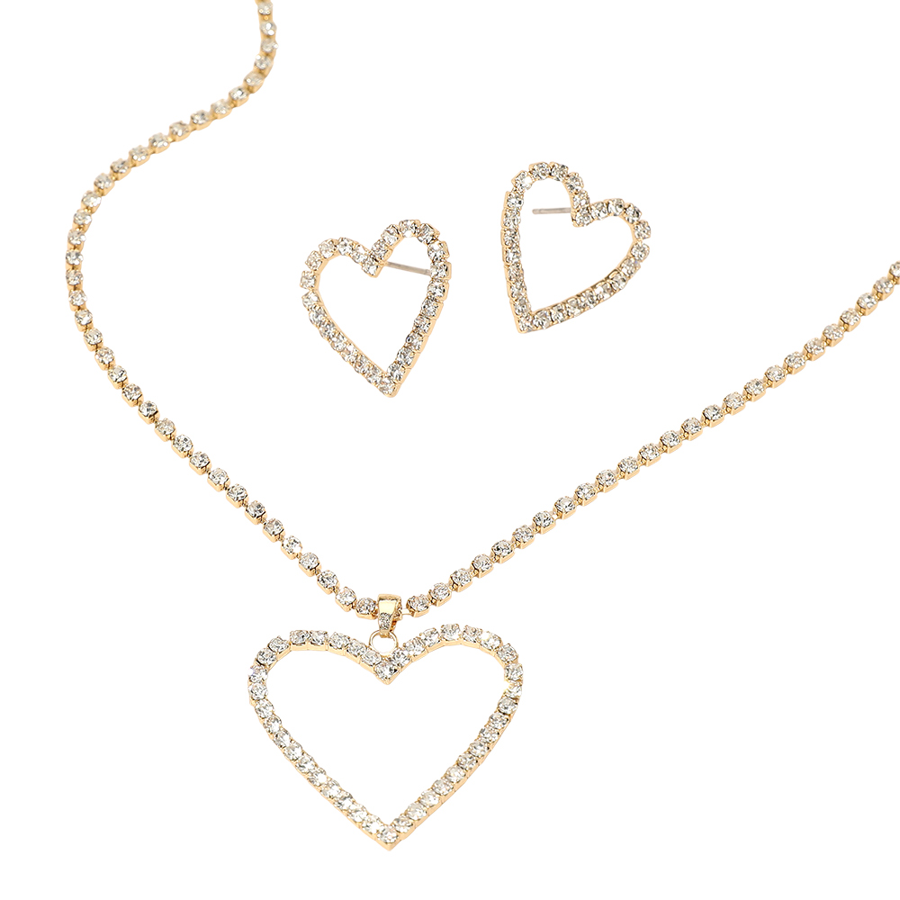 Details • Necklace Size : 16" + 3.25" L • Pendant Size : 1.25" X 1.25" • Earrings Size : 0.8" L • This elegant jewelry set features a heart shaped pendant necklace paired with matching heart stud earrings for a coordinated, timeless look. Designed to add sparkle and charm to everyday outfits or special occasions, it’s perfect for gifting, Valentine themed collections, or romantic boutique displays. Ideal for layering or wearing as a complete matching set. • Gold Dipped • Lead and Nickel Compliant