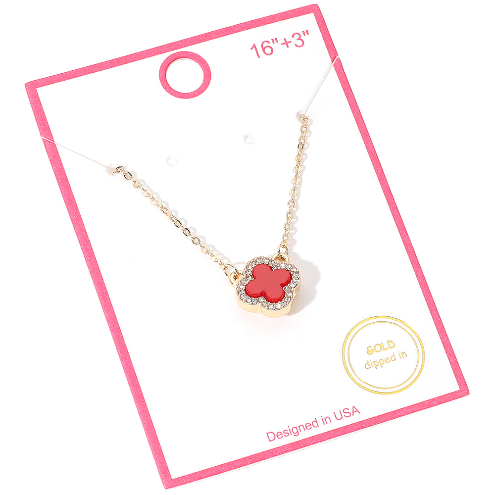 Gold Dipped Rhinestone Trim Quatrefoil Pendant Necklace