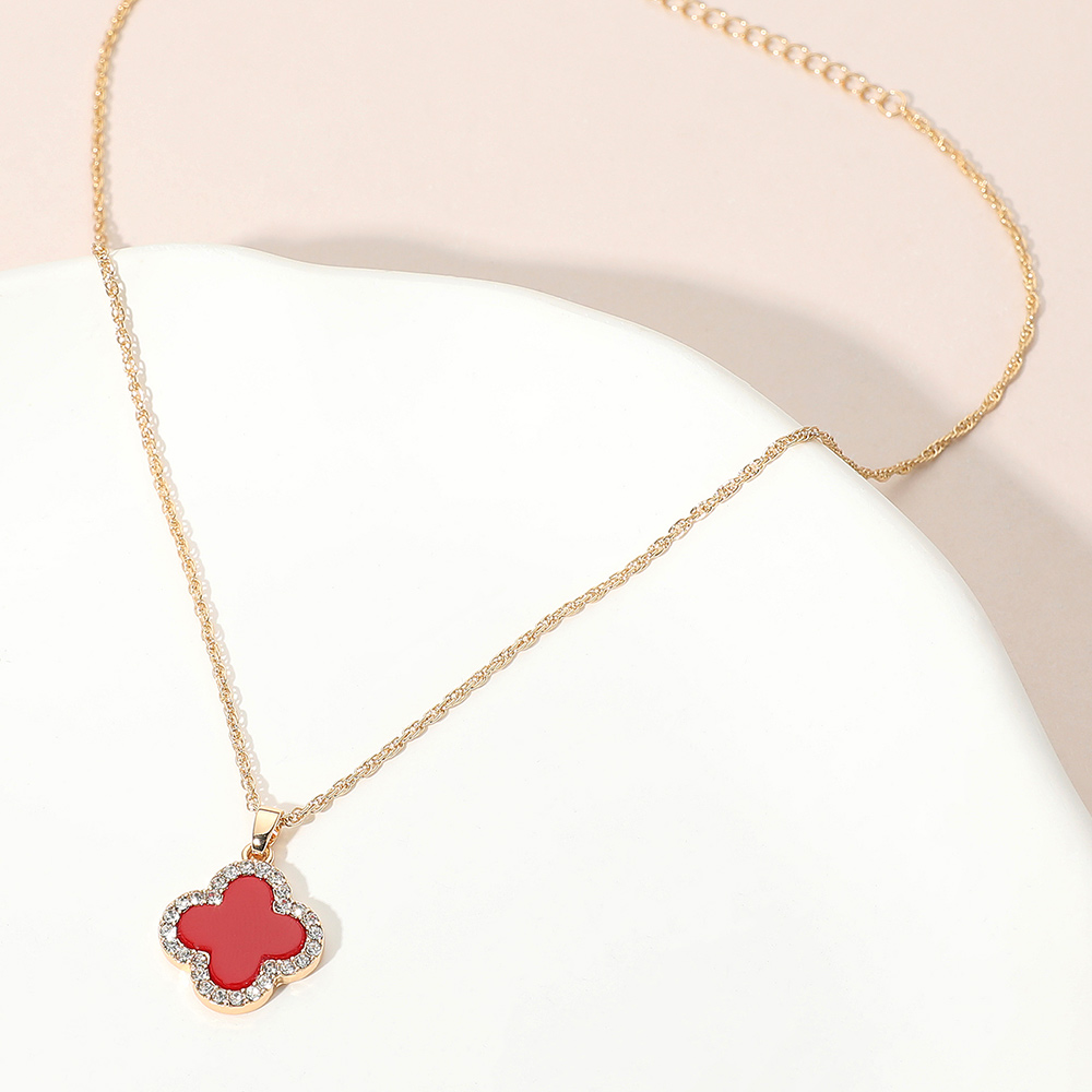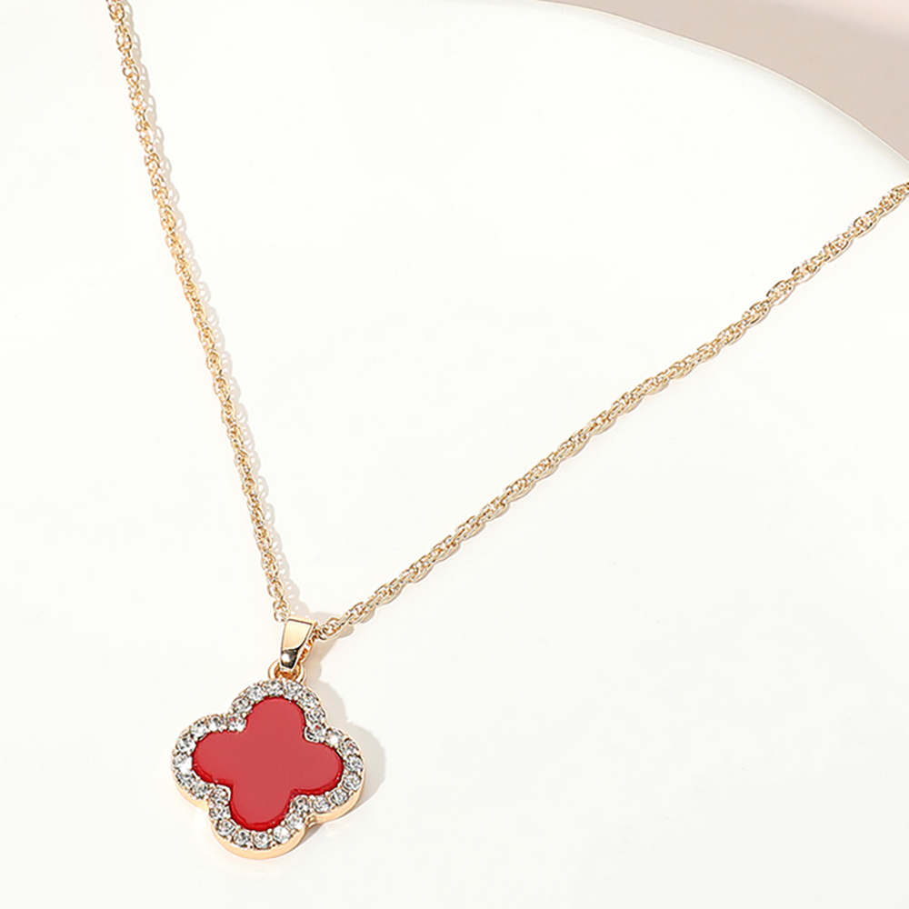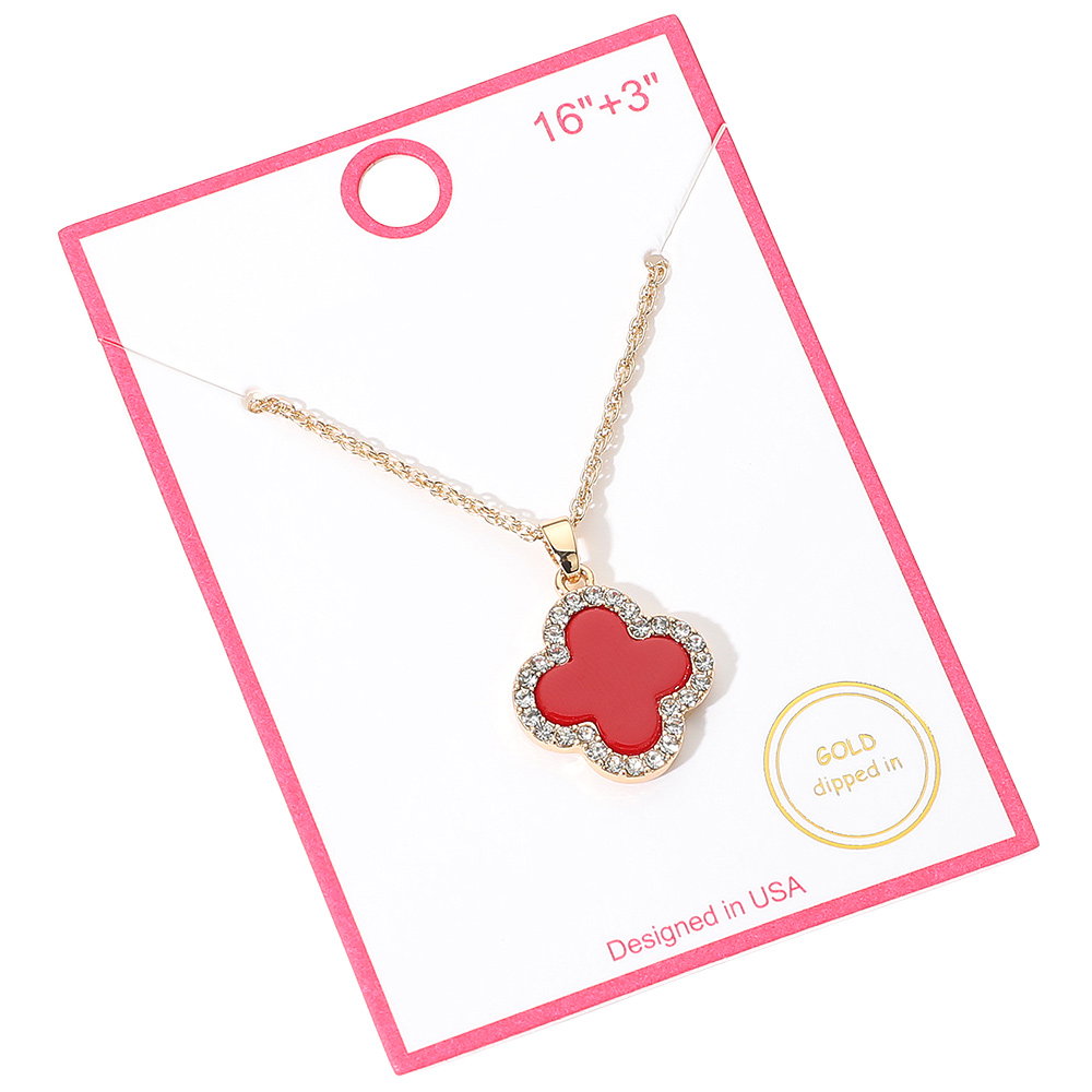 Details • Necklace Size : 16" + 3" L • Pendant Size: 0.75" X 1" • This radiant quatrefoil outline pendant necklace features a hollow design surrounded by shimmering stones for a touch of elegance. Its delicate chain and timeless silhouette create a versatile accessory that complements both everyday wear and special occasions with effortless charm. • Gold Dipped • Lead and Nickel Compliant