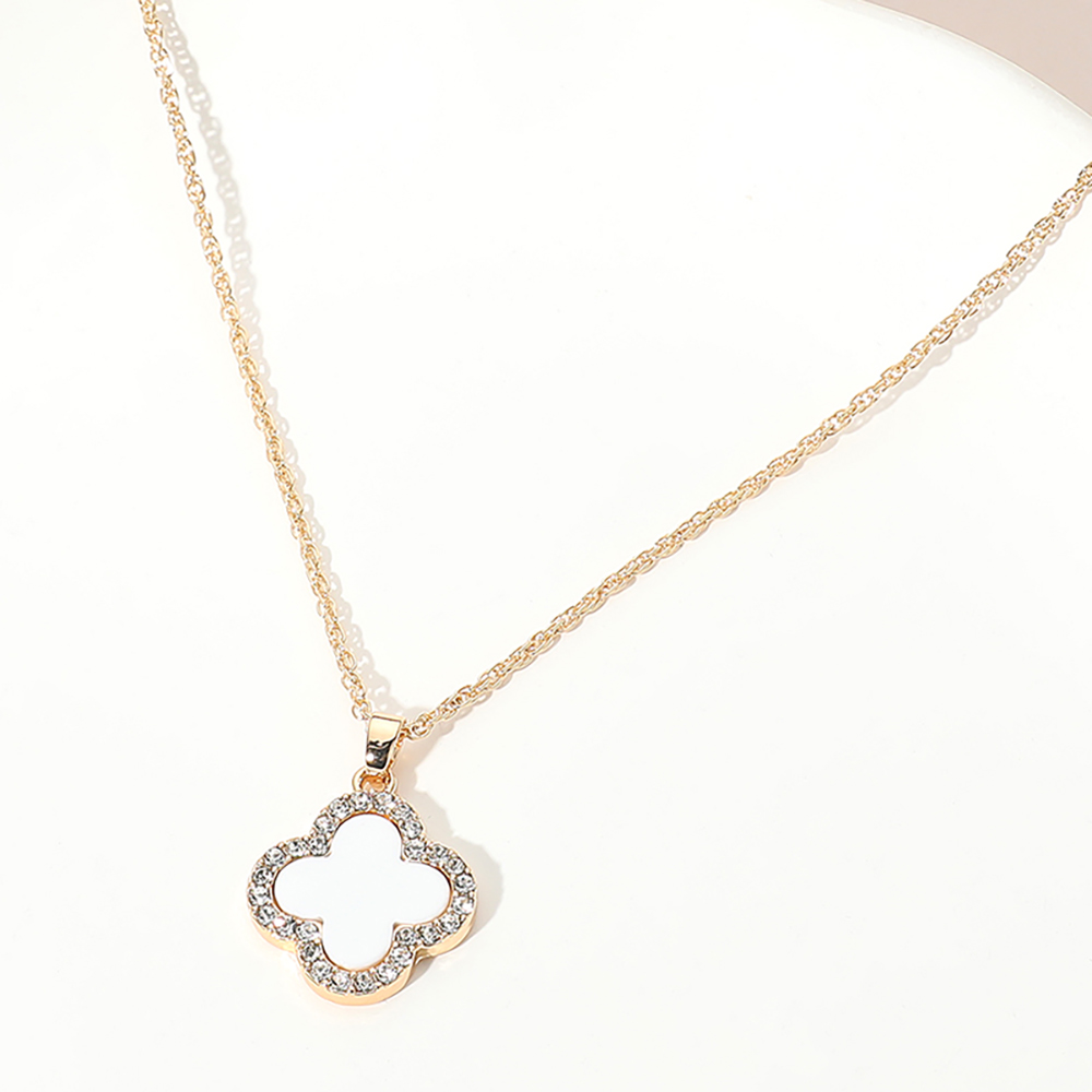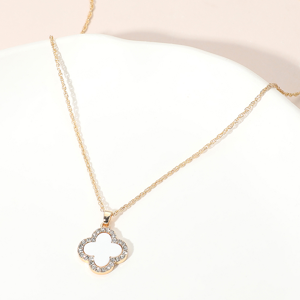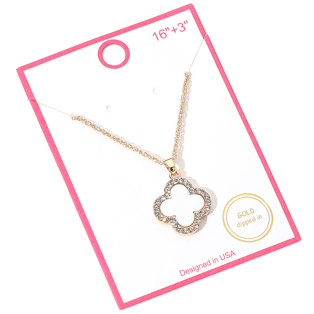 Details • Necklace Size : 16" + 3" L • Pendant Size: 0.75" X 1" • This radiant quatrefoil outline pendant necklace features a hollow design surrounded by shimmering stones for a touch of elegance. Its delicate chain and timeless silhouette create a versatile accessory that complements both everyday wear and special occasions with effortless charm. • Gold Dipped • Lead and Nickel Compliant