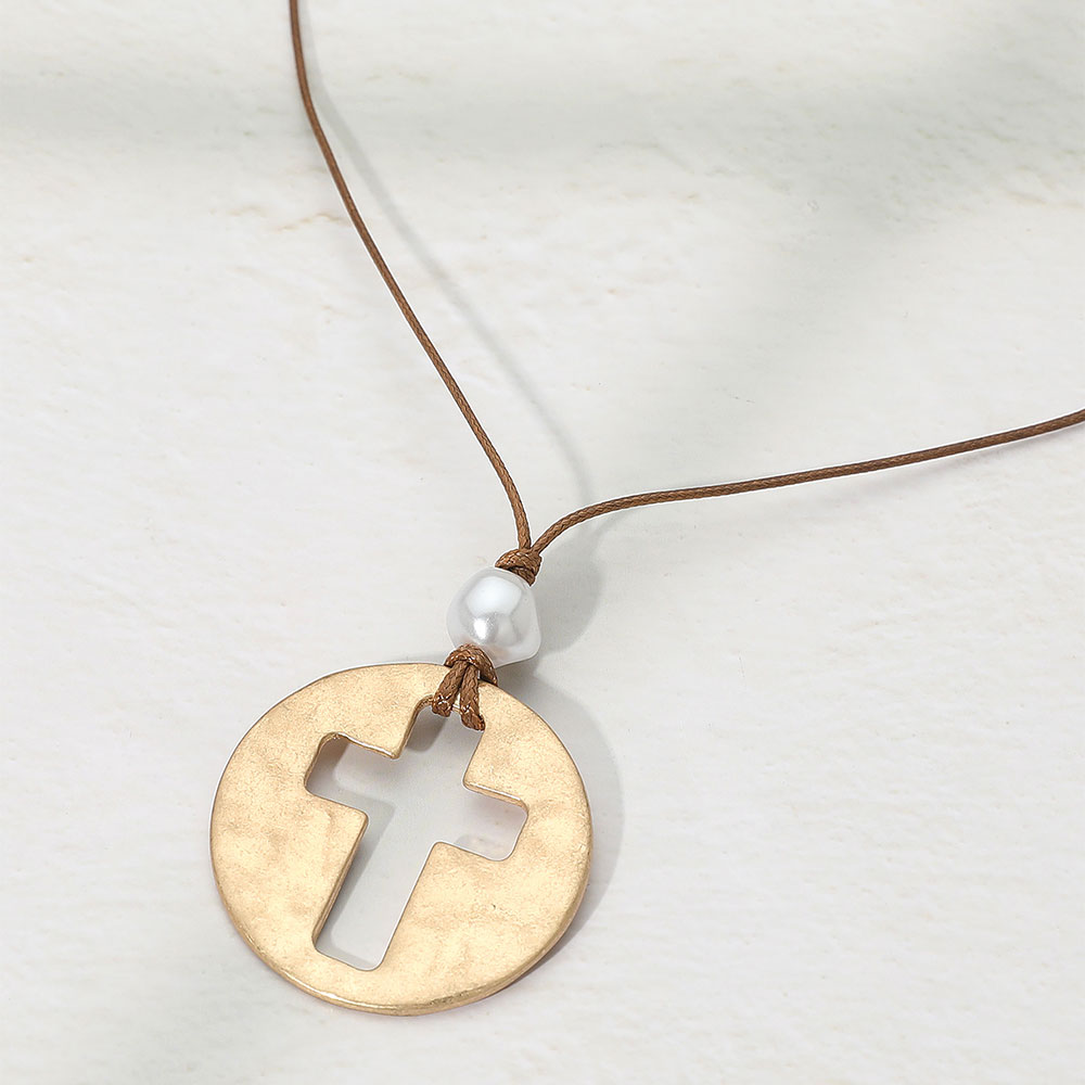 Details • Necklace Size : 17" + 3" L • Pendant Size : 1.6" X 2.2" • Embrace meaningful style with this round pendant necklace featuring a bold cross cut-out for a symbolic touch. Designed with a lightweight cord chain and adjustable closure, it blends faith and fashion for everyday wear. Perfect for layering or as a statement piece with casual or dressy outfits. • Lead and Nickel Compliant