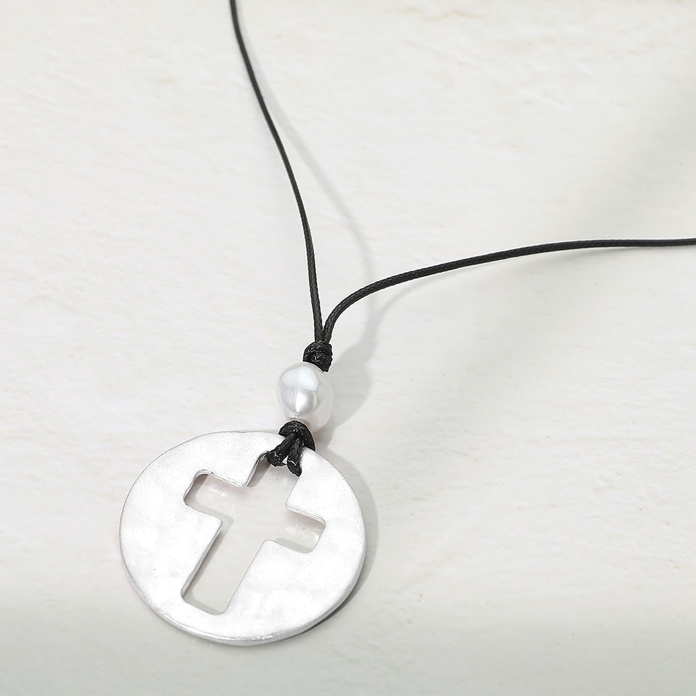 Details • Necklace Size : 17" + 3" L • Pendant Size : 1.6" X 2.2" • Embrace meaningful style with this round pendant necklace featuring a bold cross cut-out for a symbolic touch. Designed with a lightweight cord chain and adjustable closure, it blends faith and fashion for everyday wear. Perfect for layering or as a statement piece with casual or dressy outfits. • Lead and Nickel Compliant