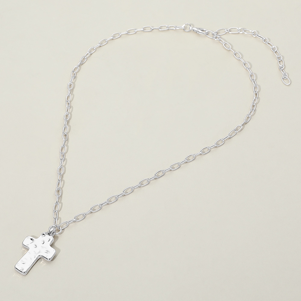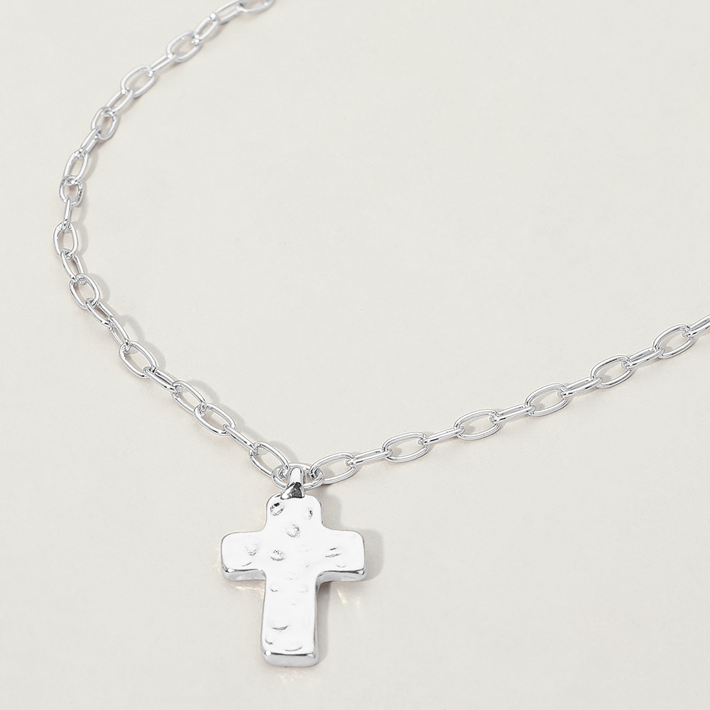 Hammered Metal Cross Charm Pendant Paperclip Chain Necklace