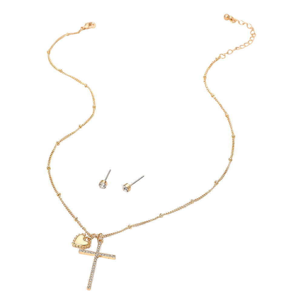 Details • Necklace Size : 16" + 2" L • Pendant Size : 0.75" X 1.25" • Earrings Size : 0.2" L • Add meaningful elegance to your look with this delicate pendant necklace featuring a heart and cross charm, paired with classic stud earrings. Perfect for everyday wear or special moments, this set brings a subtle shine and thoughtful style to any outfit. • Lead and Nickel Compliant