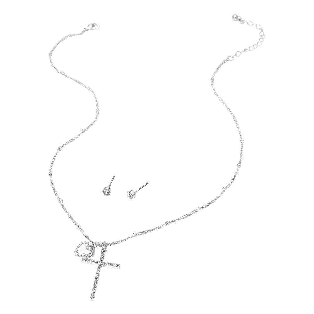 • Add meaningful elegance to your look with this delicate pendant necklace featuring a heart and cross charm, paired with classic stud earrings. Perfect for everyday wear or special moments, this set brings a subtle shine and thoughtful style to any outfit.