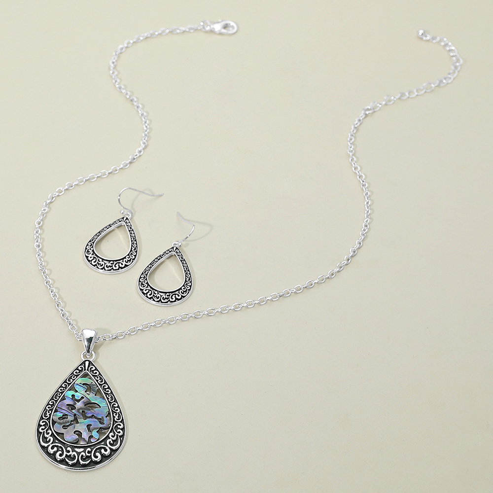 Details • Necklace Size : 18" + 3.5" L • Pendant Size : 1.3" X 2.4" • Earrings Size : 1.6" L • Complete your look with this stunning abalone teardrop pendant and matching earring set. The intricate scrollwork detailing enhances the natural shimmer of the design, creating a sophisticated and eye-catching ensemble perfect for any occasion. • Lead and Nickel Compliant
