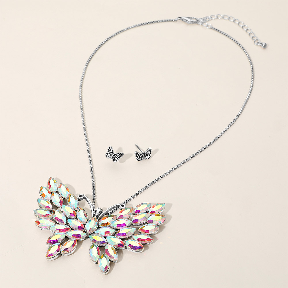 • Elegant butterfly necklace and matching stud earrings with dazzling crystals. A delicate yet bold accessory that adds charm and sparkle to evening wear, parties, and special occasions.