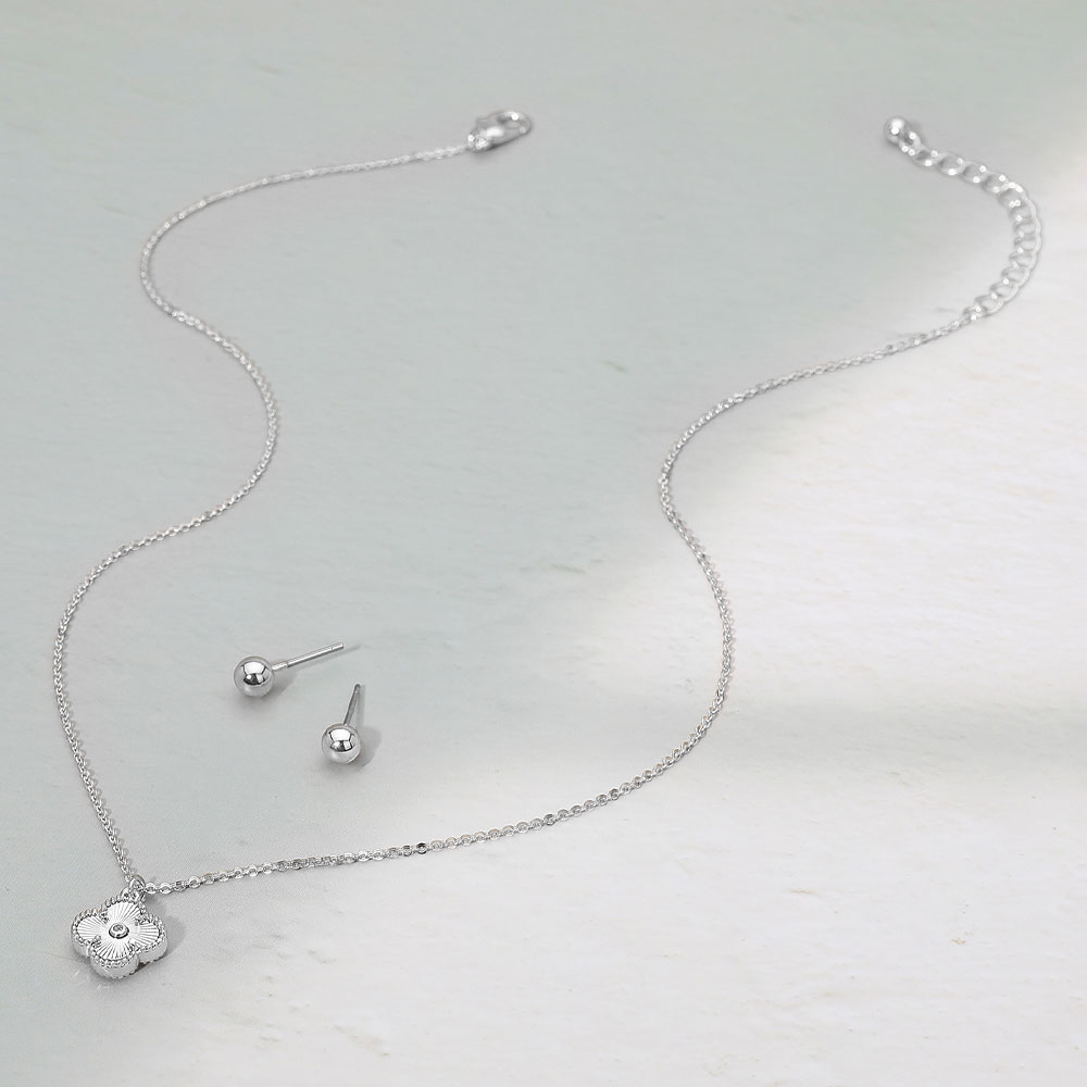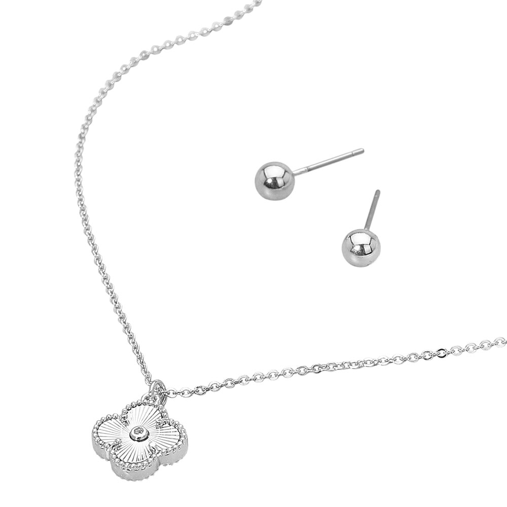 Details • Necklace Size : 16.5" + 2.25" L • Pendant Size : 0.5" X 0.6" • Earrings Size : 0.2" L • Chic four-leaf quatrefoil necklace set featuring a delicate clover pendant and matching stud earrings. Its elegant design adds a refined touch of charm and sophistication, perfect for daily wear or gifting, symbolizing luck, beauty, and timeless feminine grace. • Lead and Nickel Compliant