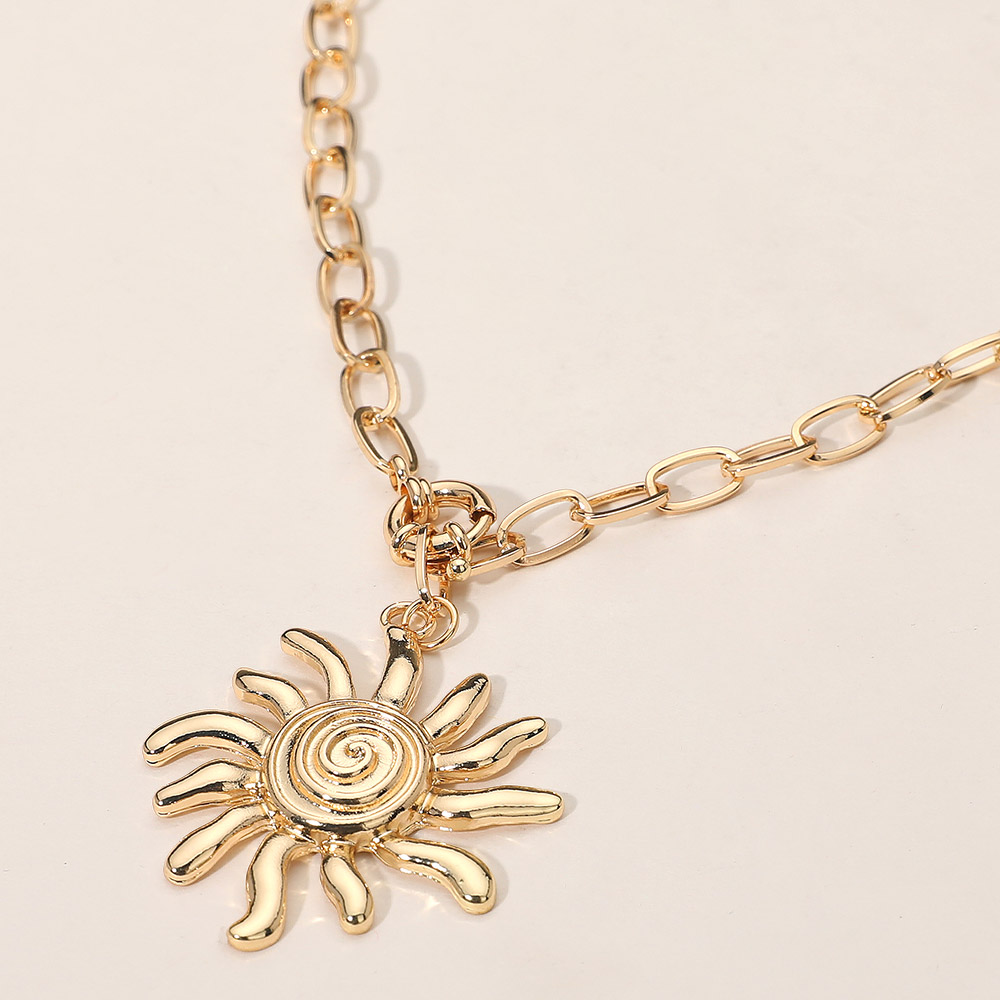 Details • Necklace Size : 16" + 0.5" L • Pendant Size : 1.6" X 2" • Add a touch of radiant charm with this spiral sun pendant chain necklace. Its unique sunburst design and bold link chain create a striking statement piece that captures warmth and vitality. Perfect for layering or wearing solo to elevate any look with effortless elegance. • Lead and Nickel Compliant