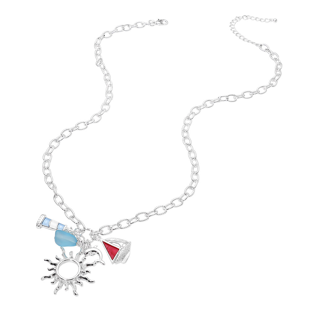 Details • Necklace Size : 24" + 3" L • Pendant Size : 1.5" X 2.1" • Nautical-inspired pendant necklace featuring playful seaside charms that add movement and character to any outfit. Designed for coastal, vacation, and everyday styling, this statement necklace appeals to customers who love ocean themes, travel vibes, and layered charm accessories for casual or resort looks. • Lead and Nickel Compliant