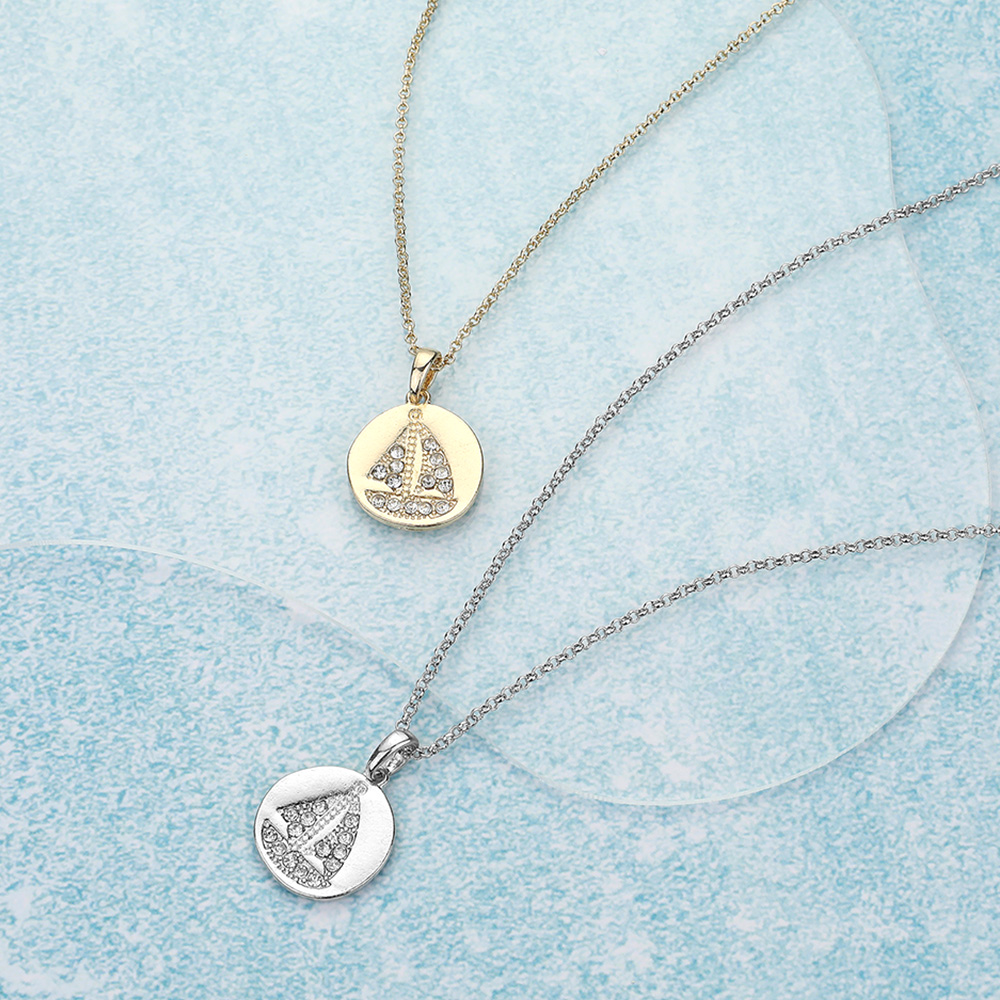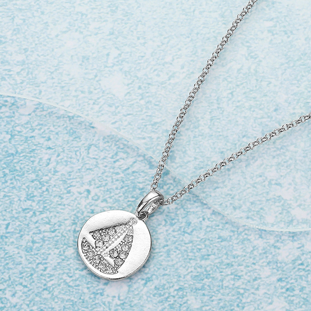 Details • Necklace Size : 16" + 3" L • Decor Size : 0.75" X 0.75" • Sail away in style with this gold sailboat pendant necklace. Features a round charm with sparkling crystals, perfect for ocean lovers and beach-inspired fashion. Ideal gift or vacation accessory. • Lead and Nickel Compliant