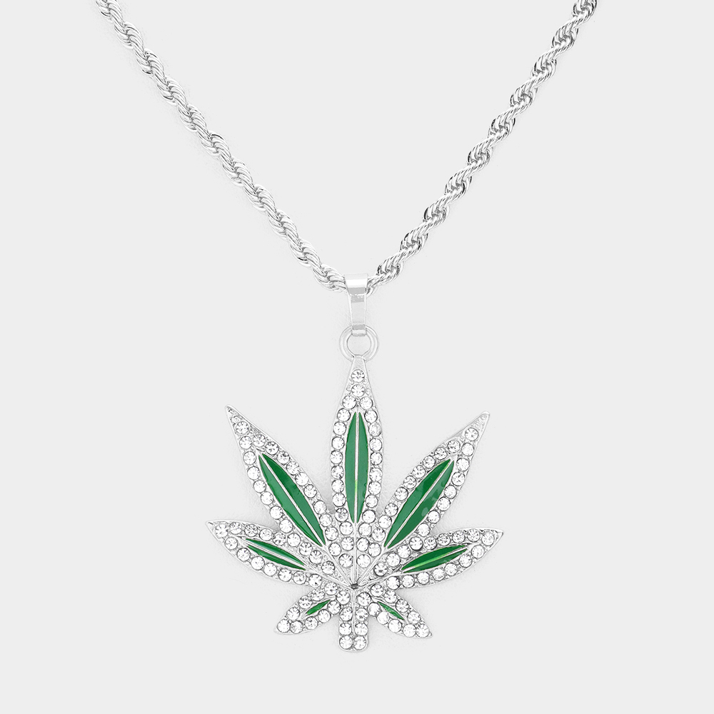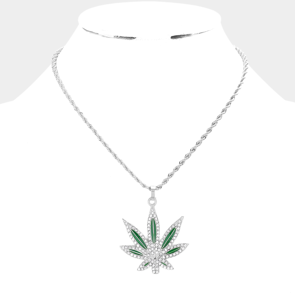 Rhinestone Embellished Enamel Metal Hemp Leaf Pendant Necklace