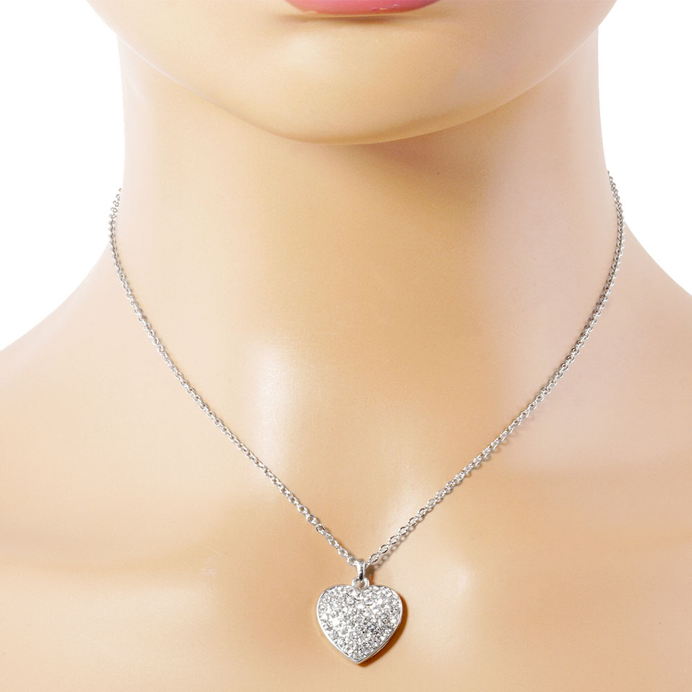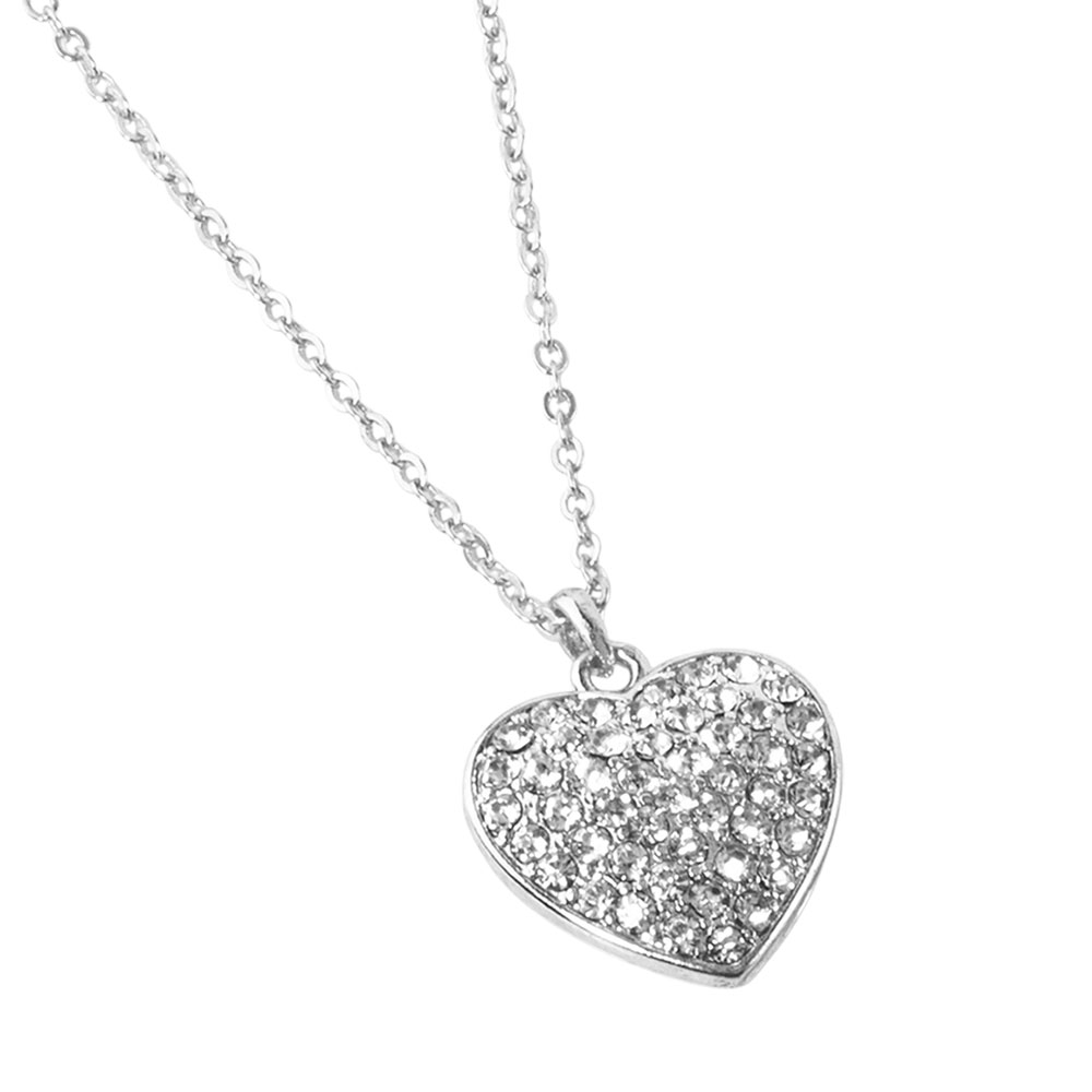 Details • Necklace Size : 15.5" + 2" L • Pendant Size : 0.75" X 0.8" • Charming heart pendant necklace featuring a sparkling rhinestone design on a delicate chain. A timeless accessory that adds subtle shine to everyday outfits and special occasions. Perfect as a gift or personal keepsake. • Lead and Nickel Compliant