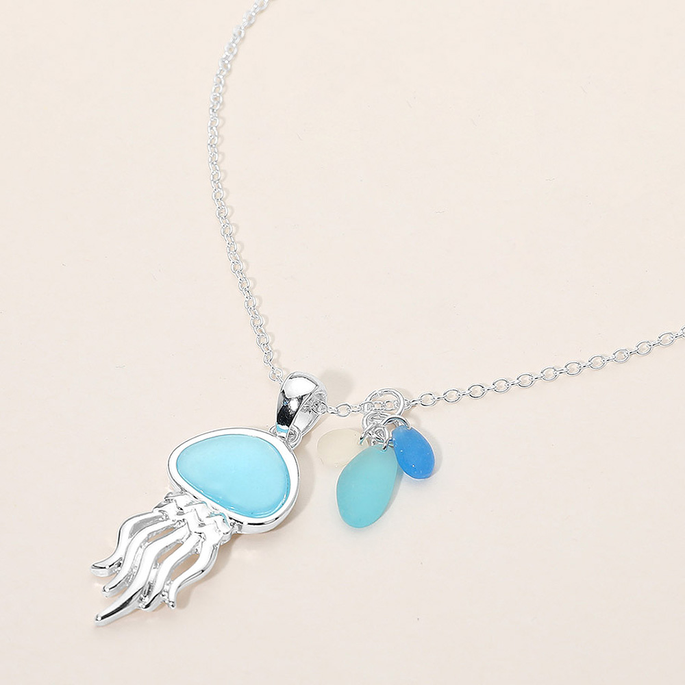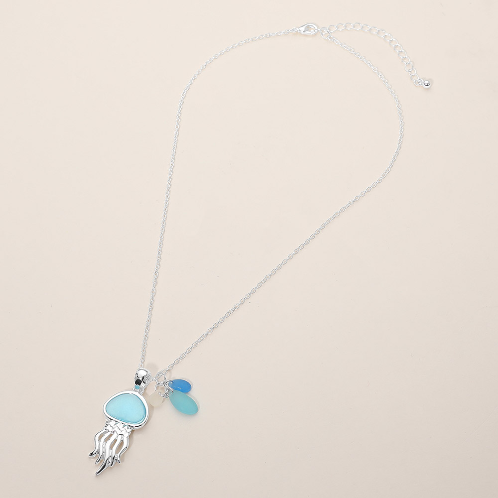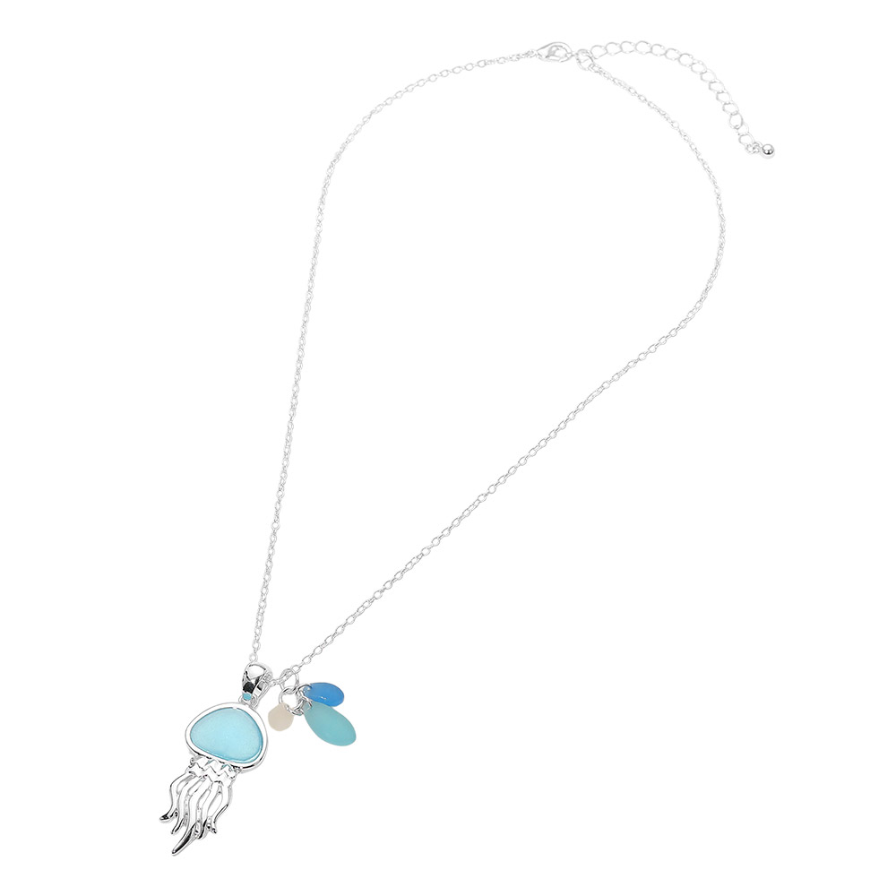 Details • Necklace Size : 18" + 3" L • Pendant Size : 0.75" X 1.8" • Whimsical jellyfish charm pendant necklace inspired by ocean life and playful movement. Featuring a floating silhouette with delicate dangling accents, this necklace adds a fun, coastal touch to everyday outfits or vacation styling. A great choice for beach boutiques, gift shops, and seasonal accessory collections looking for unique ocean-inspired designs. • Lead and Nickel Compliant
