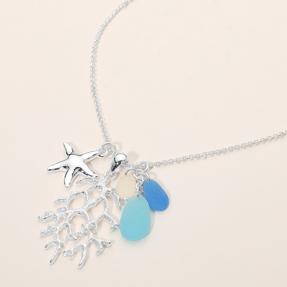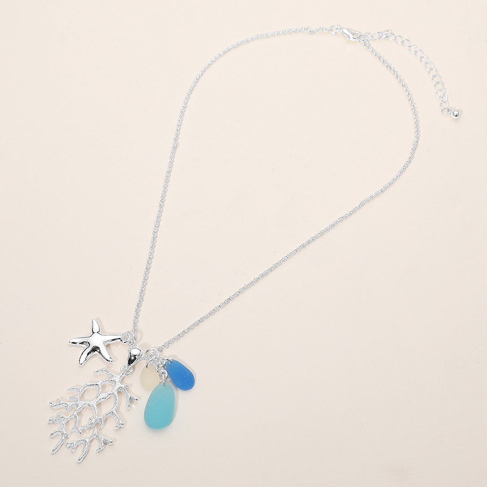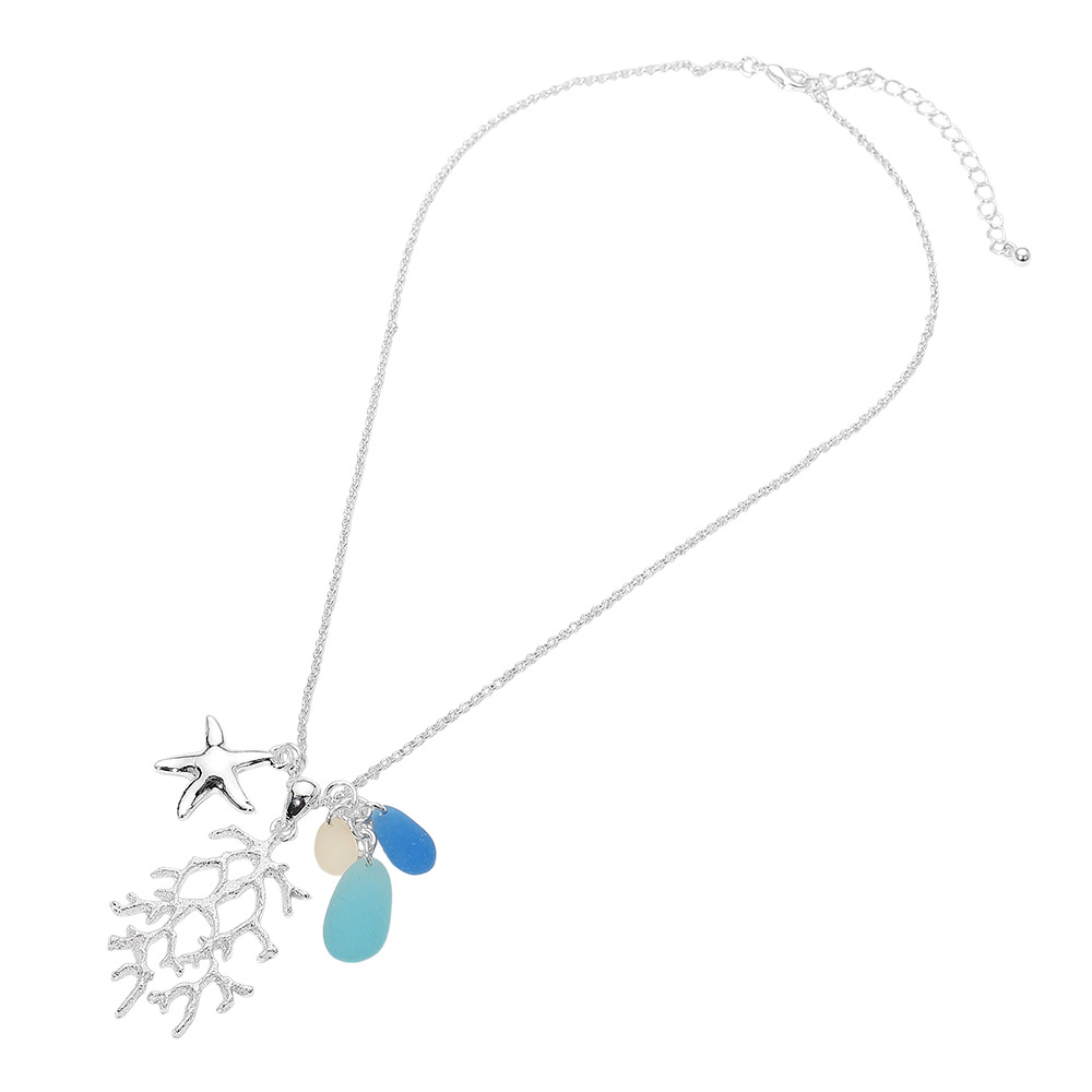 Details • Necklace Size : 18" + 3" L • Pendant Size : 1.2" X 2" • Ocean-inspired charm necklace featuring a starfish and coral motif with playful dangling accents. Designed to add a coastal touch to everyday styling, this necklace suits resort wear, beach vacations, and giftable seaside collections. Ideal for boutiques seeking fresh marine-themed jewelry with visual movement and charm. • Lead and Nickel Compliant