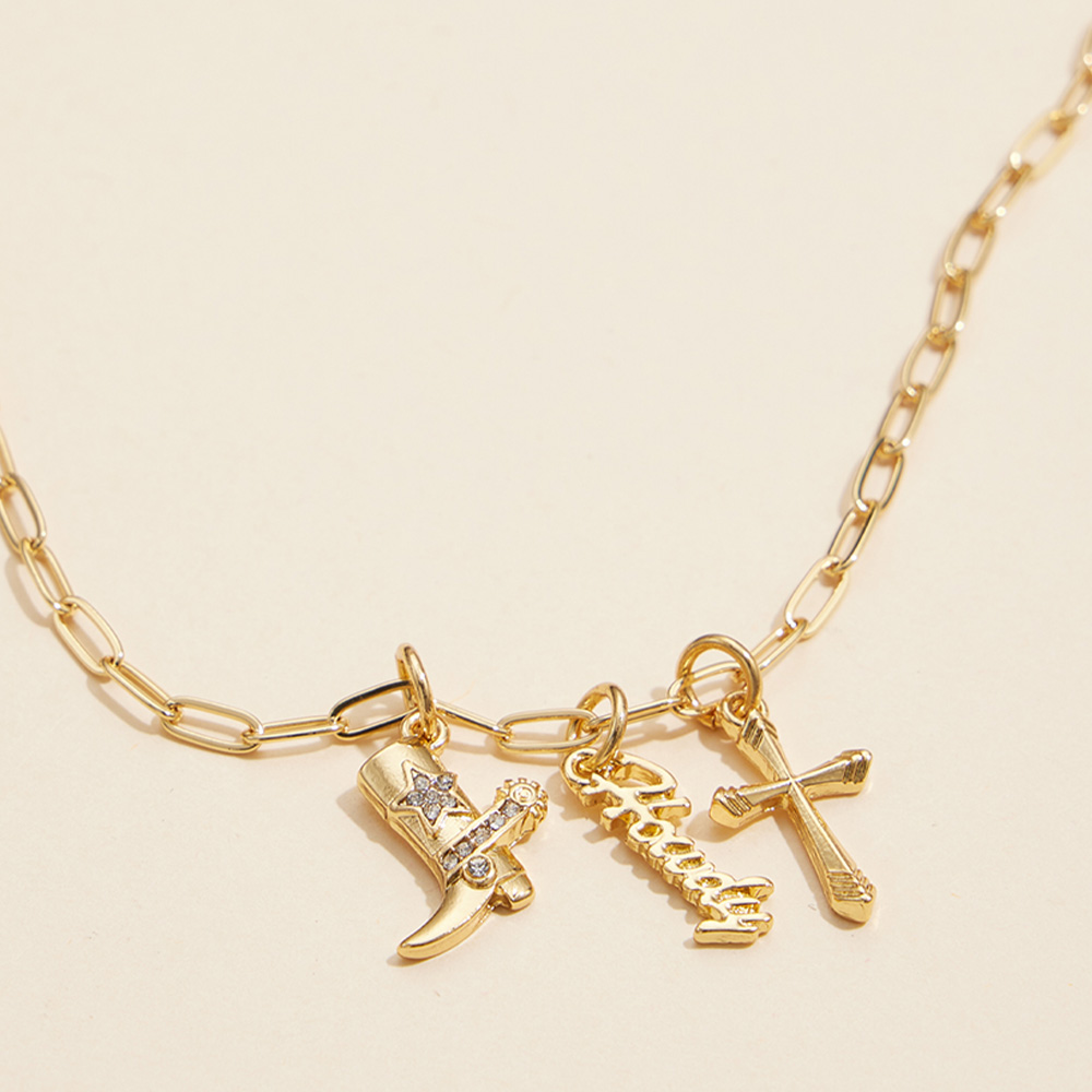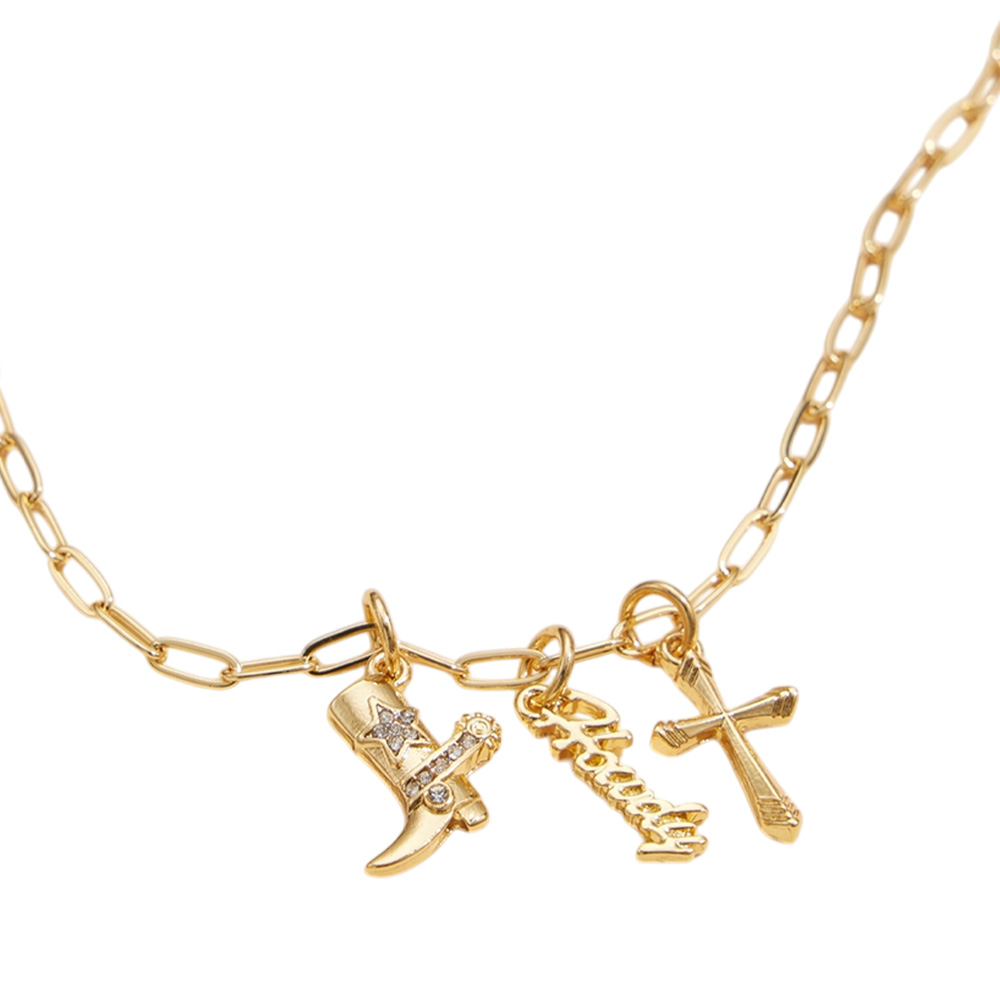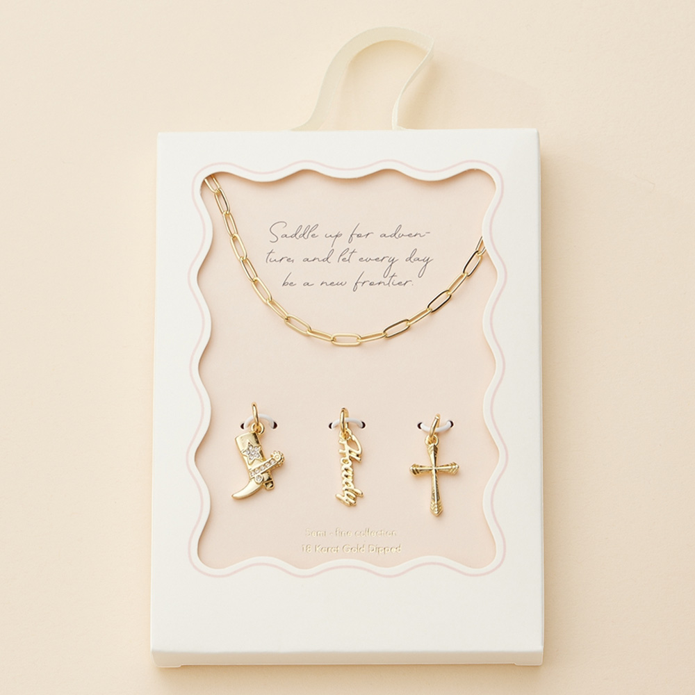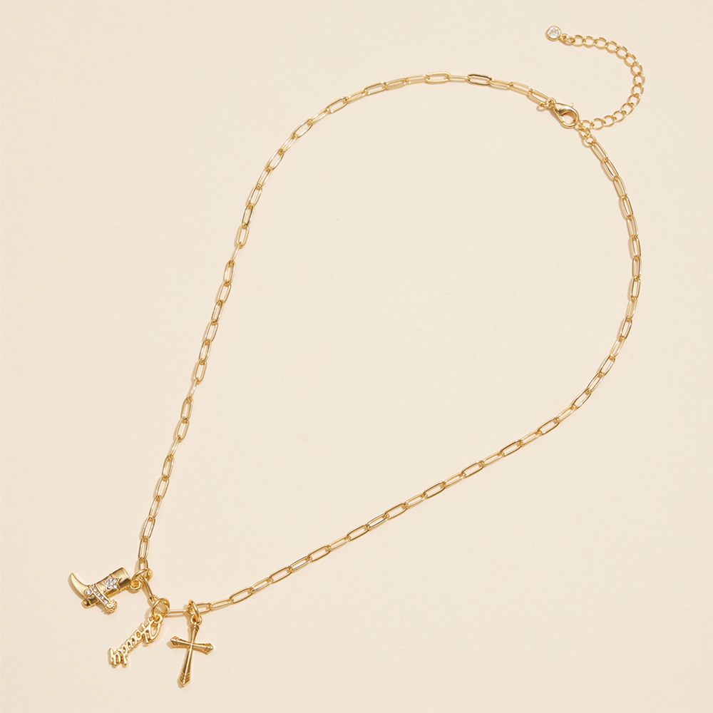 Semi Fine Collection - 18K Gold Dipped Brass Metal Howdy Message Cross Stone Paved Wester Boot Charm Pendant Paperclip Chain Necklace