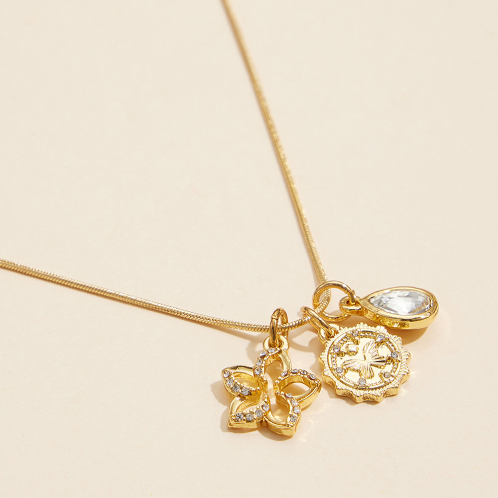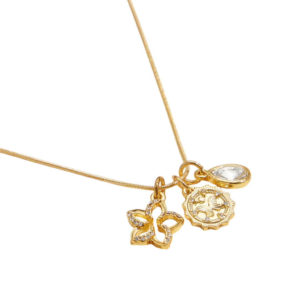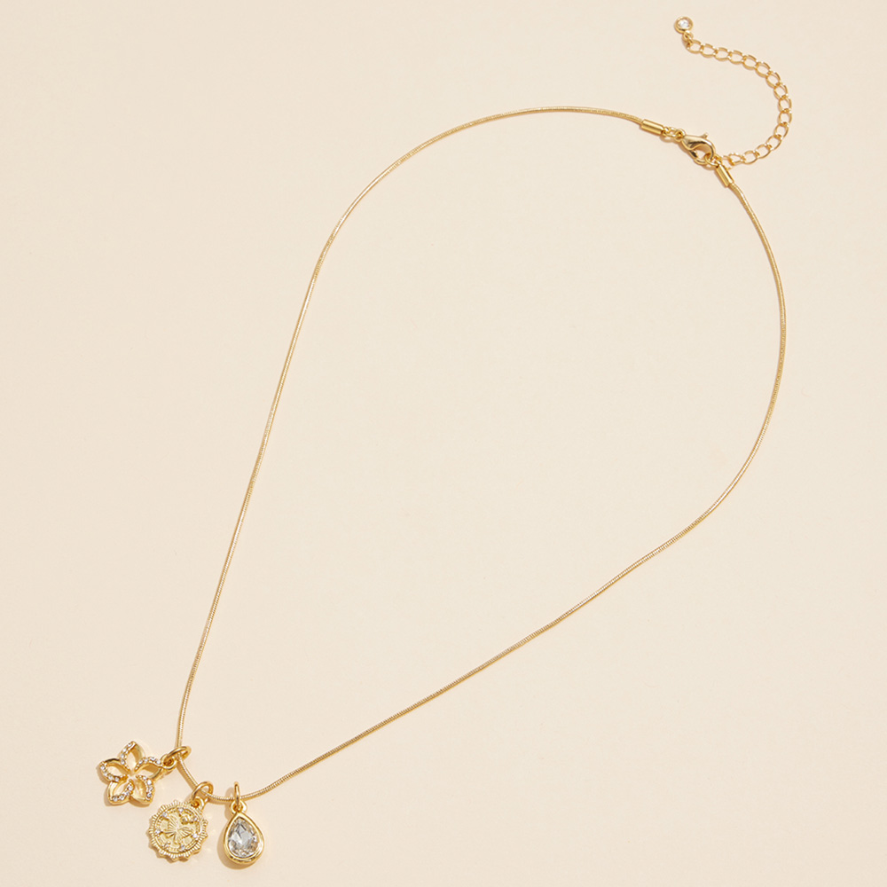 Semi Fine Collection - 18K Gold Dipped Brass Metal Stone Paved Flower Butterfly Engraved Medal Teardrop Stone Pendant Necklace