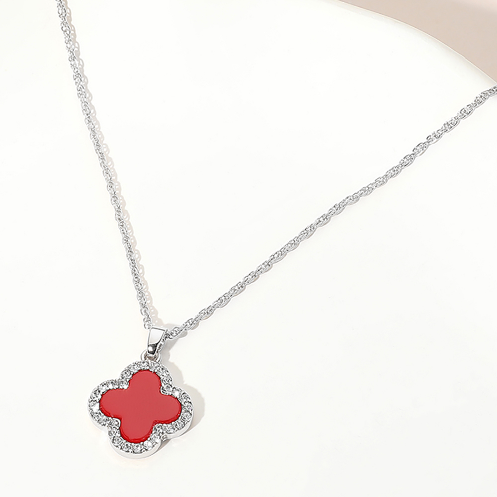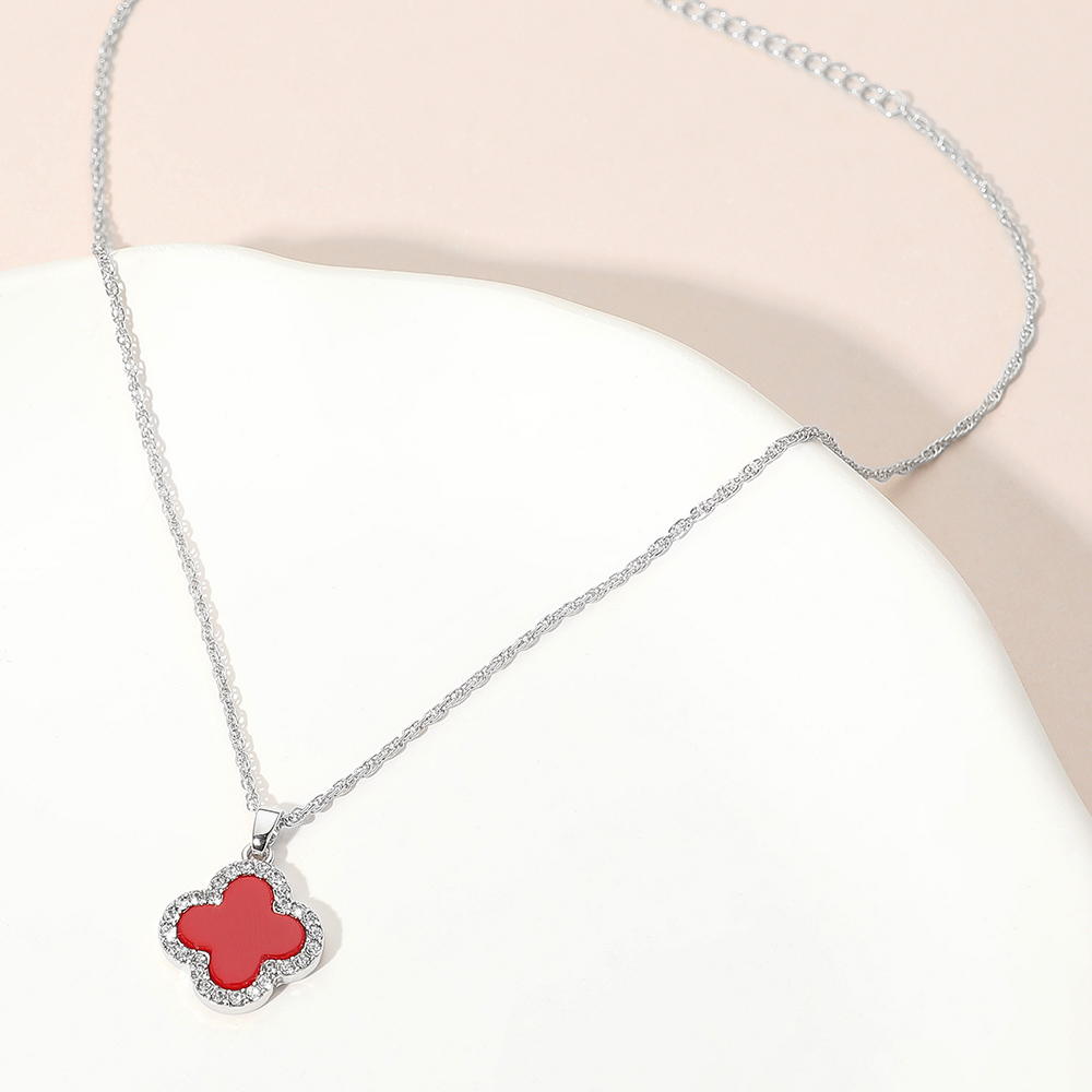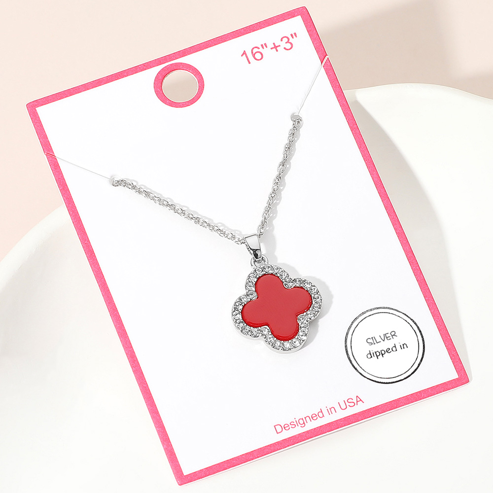 Details • Necklace Size : 16" + 3" L • Pendant Size: 0.75" X 1" • This radiant quatrefoil outline pendant necklace features a hollow design surrounded by shimmering stones for a touch of elegance. Its delicate chain and timeless silhouette create a versatile accessory that complements both everyday wear and special occasions with effortless charm. • Sterling Silver Dipped • Lead and Nickel Compliant