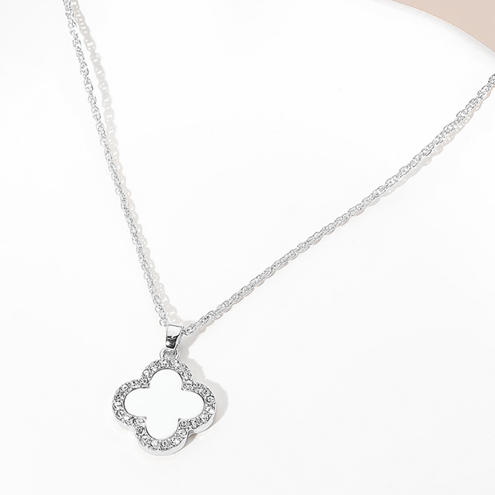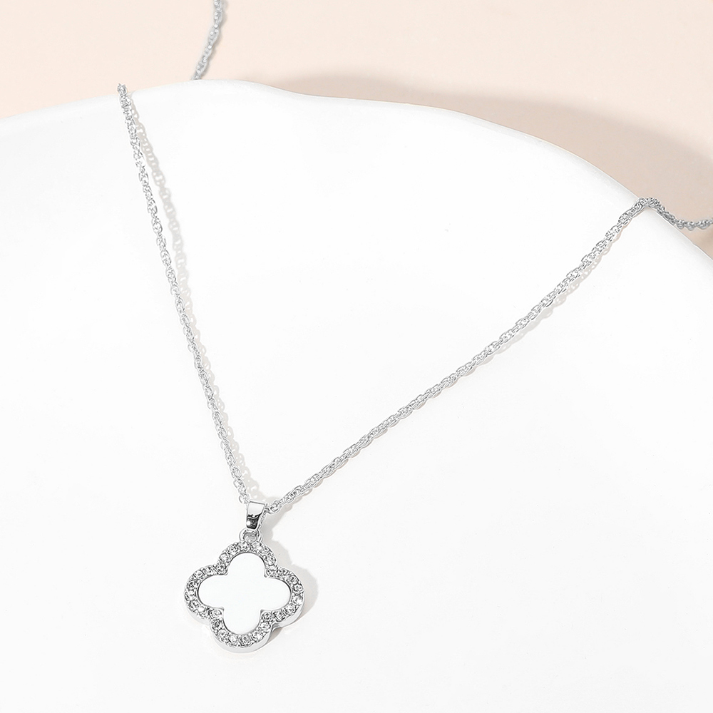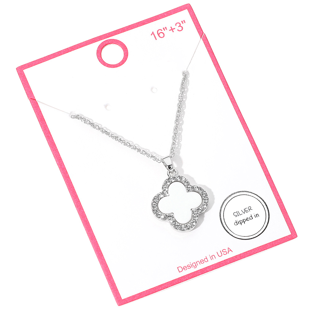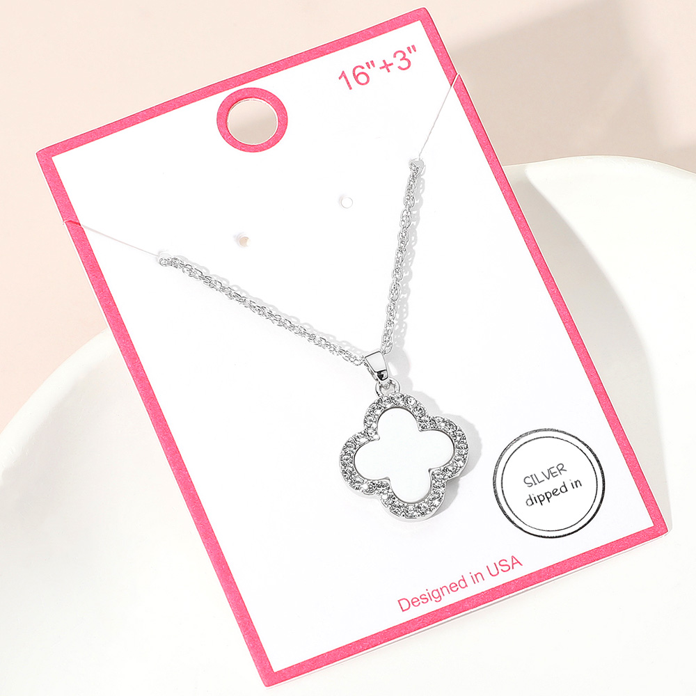 Details • Necklace Size : 16" + 3" L • Pendant Size: 0.75" X 1" • This radiant quatrefoil outline pendant necklace features a hollow design surrounded by shimmering stones for a touch of elegance. Its delicate chain and timeless silhouette create a versatile accessory that complements both everyday wear and special occasions with effortless charm. • Sterling Silver Dipped • Lead and Nickel Compliant