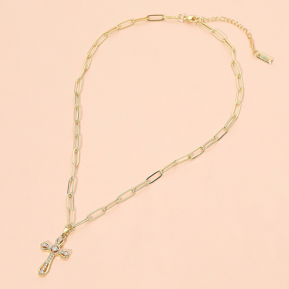Details • Necklace Size : 15.75" + 2.25"L • Pendant Size : 0.6" X 1.25" • This CZ cross charm paperclip chain necklace features a sleek open-link design paired with a sparkling cross accent for a timeless yet modern look. Perfect for everyday wear, layering, or meaningful gifting, it adds elegant shine and faith-inspired style to boutique jewelry collections. • CZ Cubic Zirconia • Stainless Steel