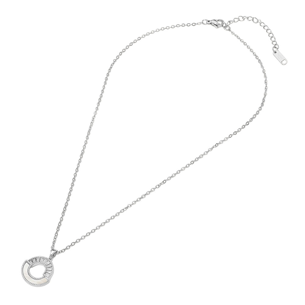 Stainless Steel CZ Pave Mother of Pearl Detail Open Circle Pendant Necklace