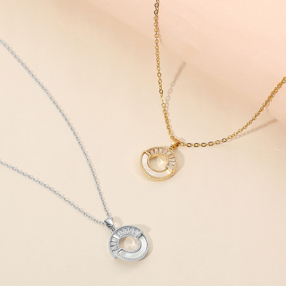 Details • Necklace Size : 15.5" + 2" L • Pendant Size : 0.6" X 0.8" • Modern open circle pendant necklace accented with a refined cz pave-style mother of pearl detail for subtle sparkle and dimension. This versatile necklace delivers a clean, contemporary look that transitions effortlessly from everyday wear to special occasions. A timeless, easy-to-style piece ideal for layering or wearing solo, perfect for boutiques seeking minimalist yet eye-catching jewelry. • CZ Cubic Zirconia • Stainless Steel