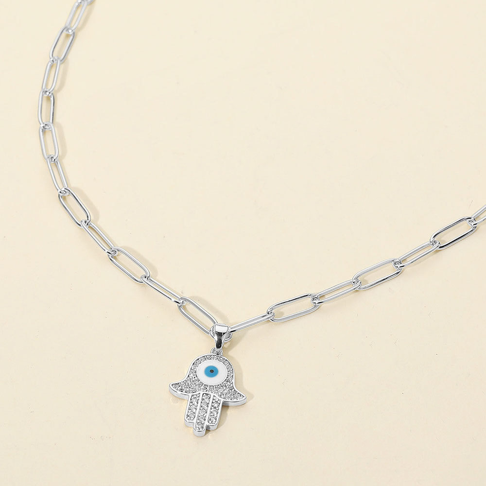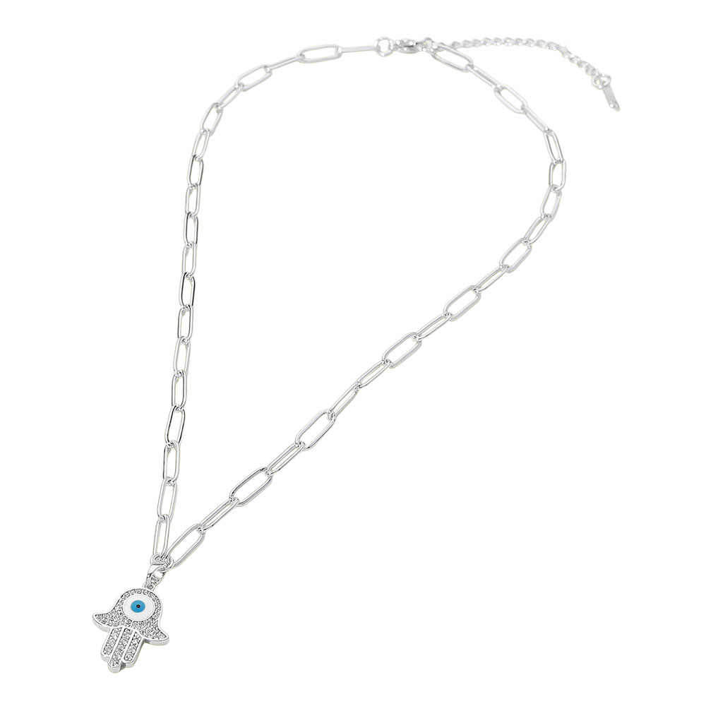 Stainless Steel CZ Stone Paved Evil Eye Hamsa Hand Pendant Paperclip Chain Necklace
